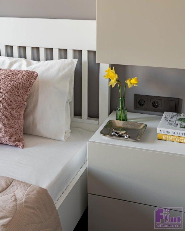 Вторую комнату отвели под спальню хозяйки. Спальню решили уменьшить за счет коридора, чтобы обустроить в последнем место для шкафа. Между коридором и кухней убрали часть перегородки с дверным проёмом, что позволило дизайнеру визуально объединить эти зоны. Ещё одно изменение коснулось ванной комнаты. Её уменьшили, чтобы немного добавить пространства для кухни. Это решение можно согласовать в разрешительных органах, если квартира находится на последнем этаже, как в этом случае. Второй санузел расширили за счёт прилегающей прихожей, что позволило найти место для стиральной и сушильной машин.