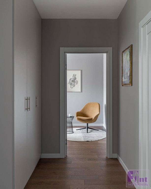 Для отделки стен выбрали краску. На пол уложили инженерную доску. «Одним из условий заказчицы было натуральное напольное покрытие во всех помещениях, кроме санузла и ванной, поэтому выбрали инженерную доску текстуры «дуб» с раскладкой разноразмерных плашек», — комментирует дизайнер.