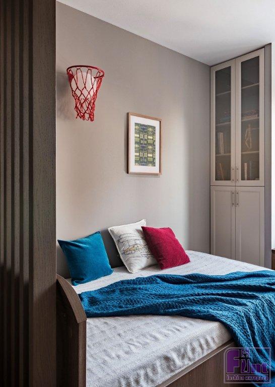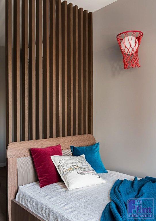 В детской на потолке смонтирован плоский светильник, на столе есть настольная лампа, а зона кровати освещается декоративным бра в виде баскетбольной корзины. «Выбор на него пал неслучайно, ребенок увлекается баскетболом», — говорит автор проекта. В спальне использовали винтажную люстру, которую хозяйка привезла из зарубежной поездки, и настольный светильник у кровати. В ванной комнате зеркало подсвечивается подвесом, который даёт мягкий свет. В холле зеркало также подсвечивается установленными по бокам от него бра.