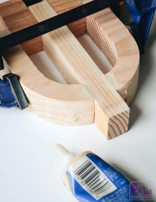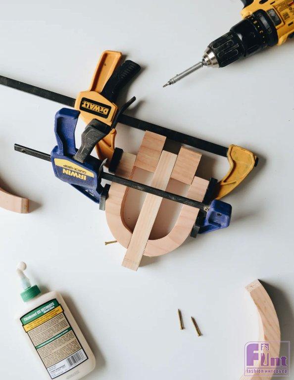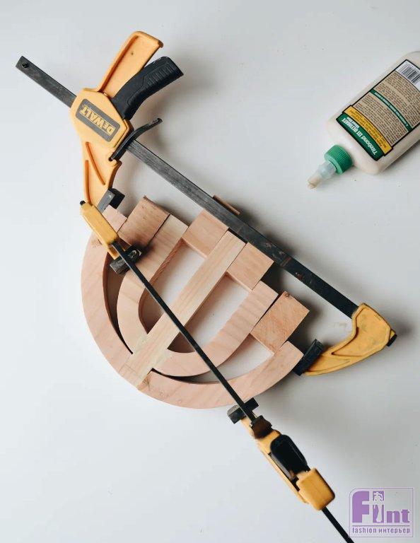 Сначала прикрепите меньшие изогнутые детали. Нанесите клей по дереву на торцы деталей и прикрепите их к прямой центральной детали. Расположите распорные брусочки между деталями и скрепите детали зажимами.