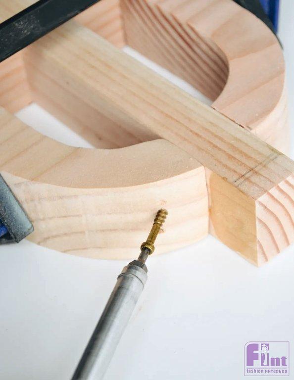 Для дополнительного механического крепления деталей используйте шурупы. Просверлите два отверстия примерно под углом 45 градусов на нижней стороне каждой боковой изогнутой детали. Обязательно продолжайте отверстие в центральной детали, чтобы при закручивании шурупа она не раскололась. Аналогичное отверстие проделайте в детали, служащей основанием светильника. Затем вкрутите шурупы в каждое из пяти проделанных отверстий. Как только шурупы будут плотно закручены, зажимы можно снять.