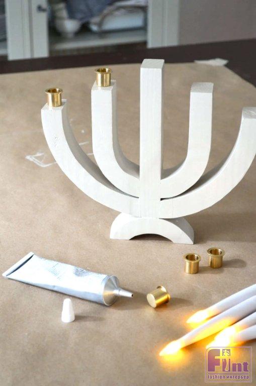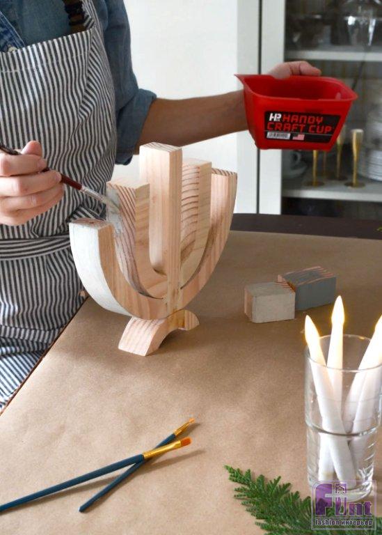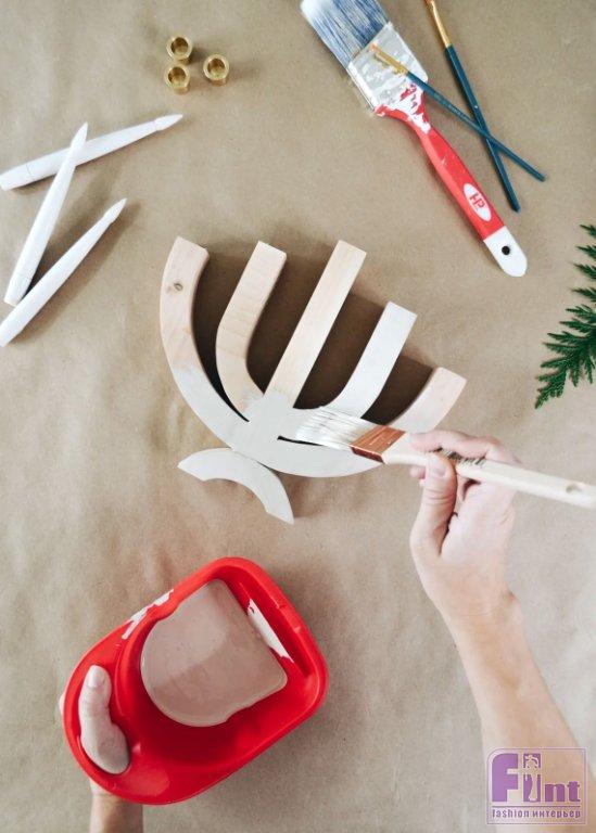 Покрасьте основу светильника краской по дереву выбранного цвета. Мы решили использовать традиционный белый оттенок краски. Также отлично смотрится красный цвет в сочетании с белыми свечами, или светильник, покрашенный золотой краской.