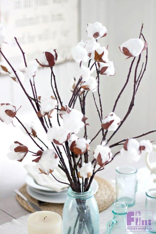 Наш букет из тонких элегантных веточек с легко узнаваемыми коробочками хлопка станет отличным дополнением к интерьеру, в каком бы стиле он не был выполнен. Лучше всего такой букет из ветвей хлопка впишется в интерьеры в стиле рустик, кантри, шебби шик и прованс, гармонично дополнив неповторимый уют, который формируют эти интерьерные стили.