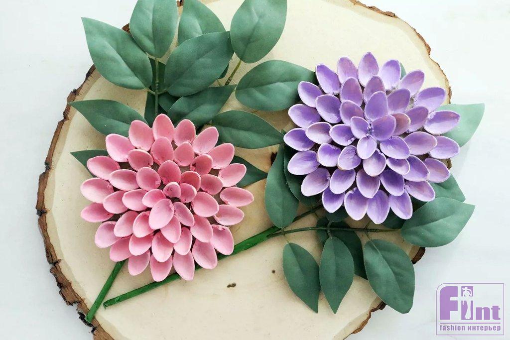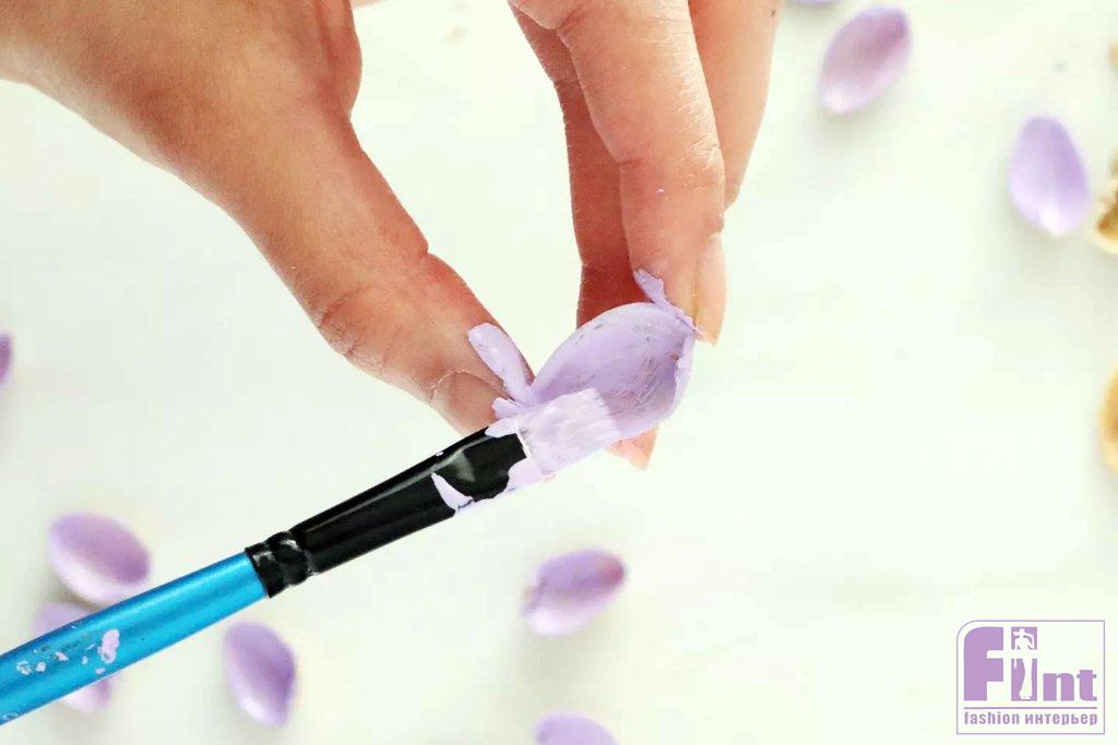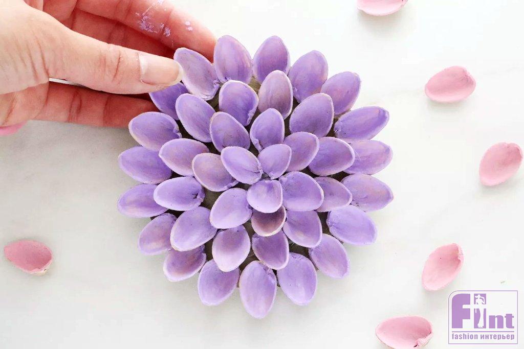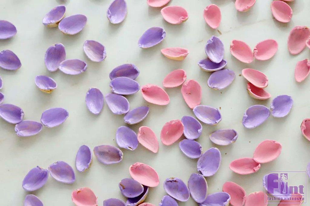 Мы решили, что на нашем панно будет два больших цветка. Поэтому использовали краску двух оттенков. Вы же можете сделать панно из одного, двух или более цветов, и раскрасить их так, как позволяют ваши навыки в рисовании (можно окрасить фисташки с плавным переходом цветов, чтобы они выглядели более реалистично). Оставьте скорлупу высыхать.