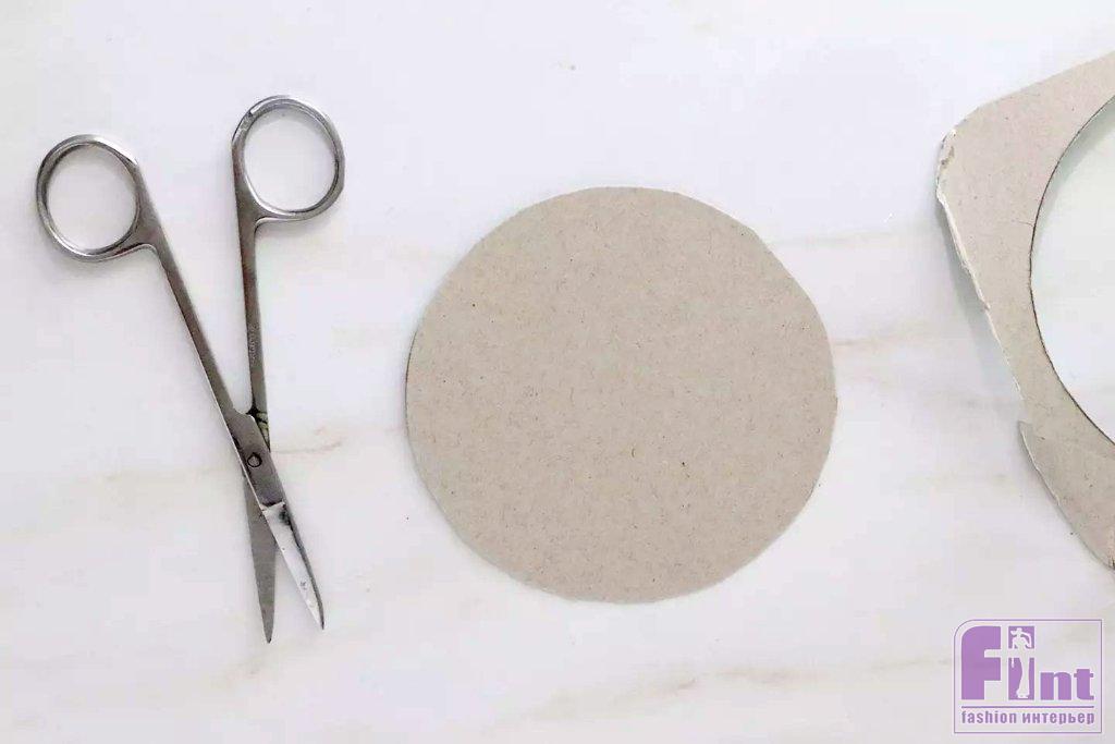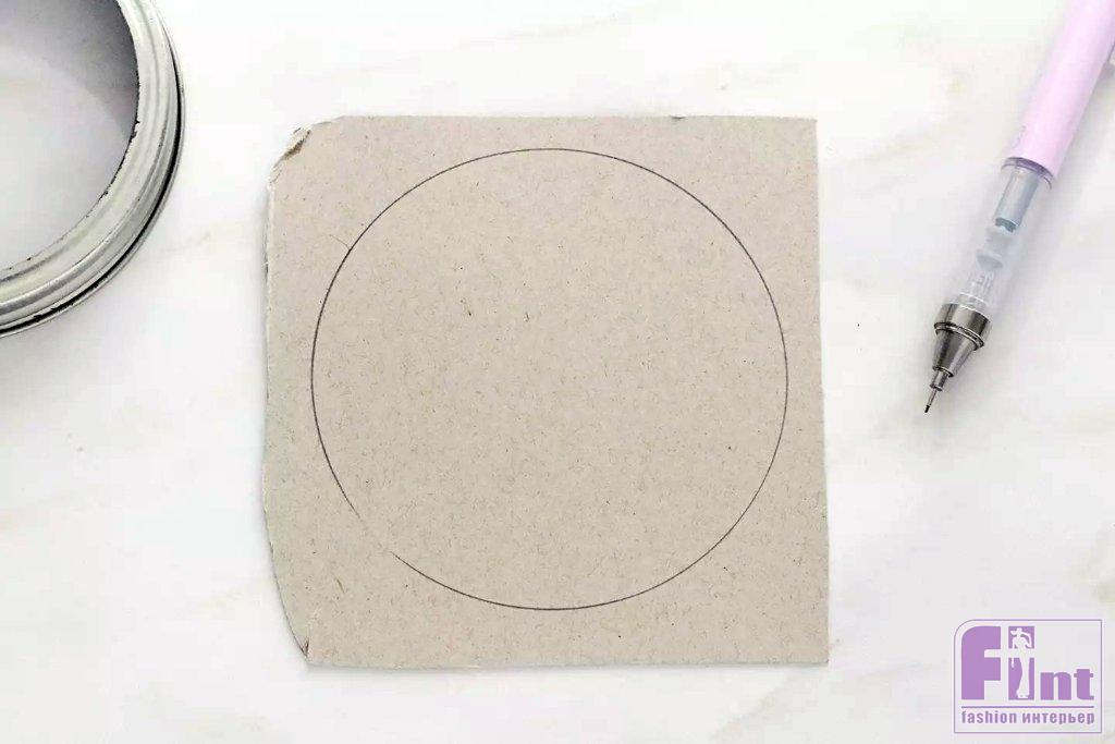 Пока фисташковая скорлупа сохнет, обведите круглый предмет на небольшом кусочке картона. Размер этого круга определит окончательный размер ваших цветов. Круг также можно нарисовать циркулем, если у вас имеется этот инструмент под рукой. Мы использовали то, что первым попалось под руку и обладало нужным нам диаметром – крышку от банки Мейсона.