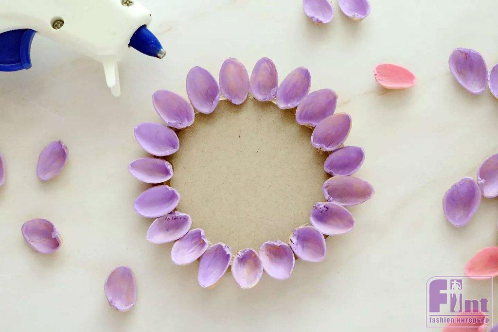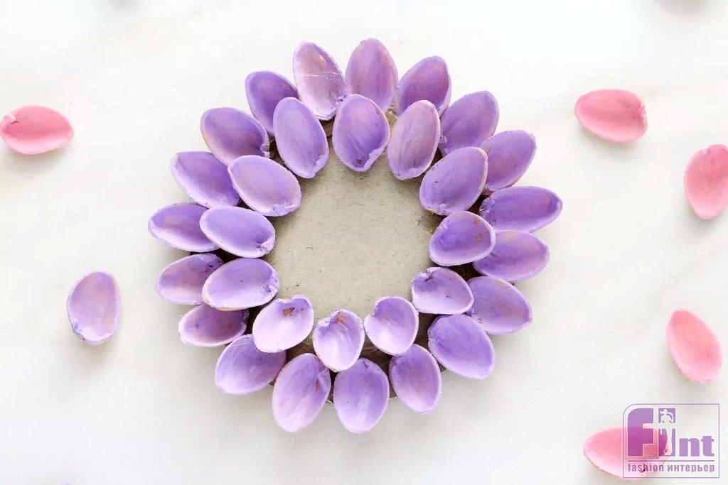 Используя горячий клей, приклейте раскрашенные фисташковые скорлупки по краю картонного круга. Расположите скорлупки под небольшим углом так, чтобы заостренный конец был направлен наружу и вверх. Укладывайте скорлупки максимально близко друг к другу, чтобы минимизировать зазор между ними.