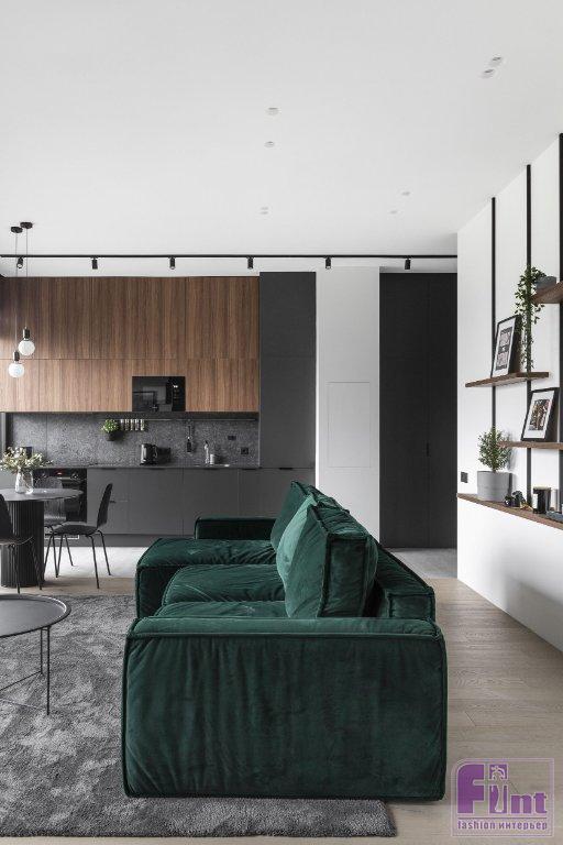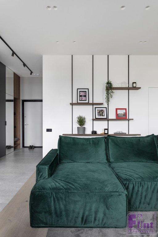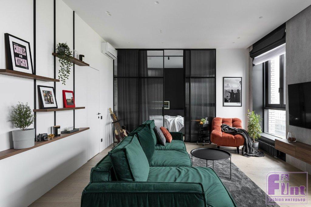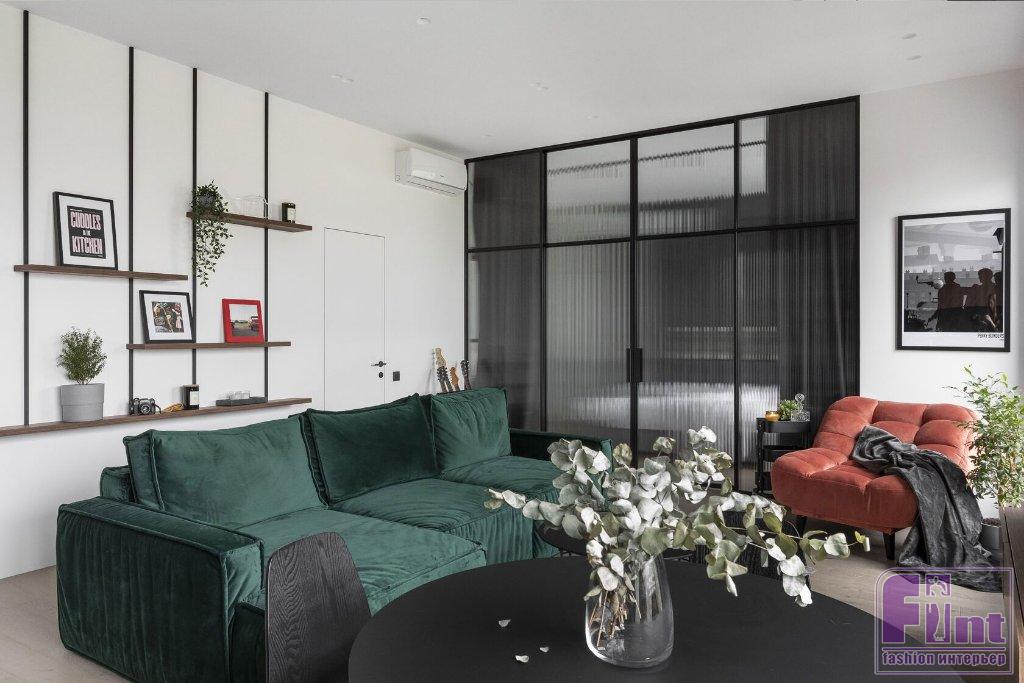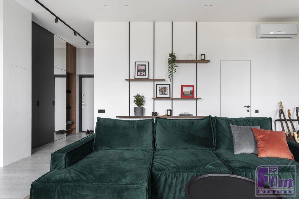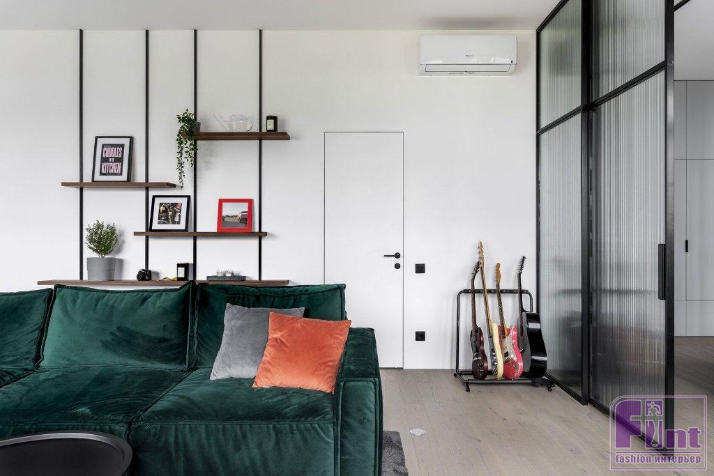 Владелица квартиры — молодая девушка. Она много времени проводит дома: работает на удалёнке, любит приглашать к себе друзей. Хозяйка обратилась к дизайнеру Екатерине Кузнецовой со следующими задачами: организовать просторную кухню-гостиную, отдельную спальню, но с возможностью объединять её с общей зоной при необходимости, большой санузел, много мест хранения, в том числе для коллекции гитар. Девушке была важна практичность интерьера, хотелось использовать белые и серые оттенки, а ещё среди пожеланий был…зеленый диван.