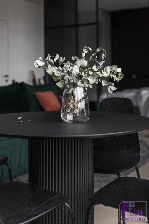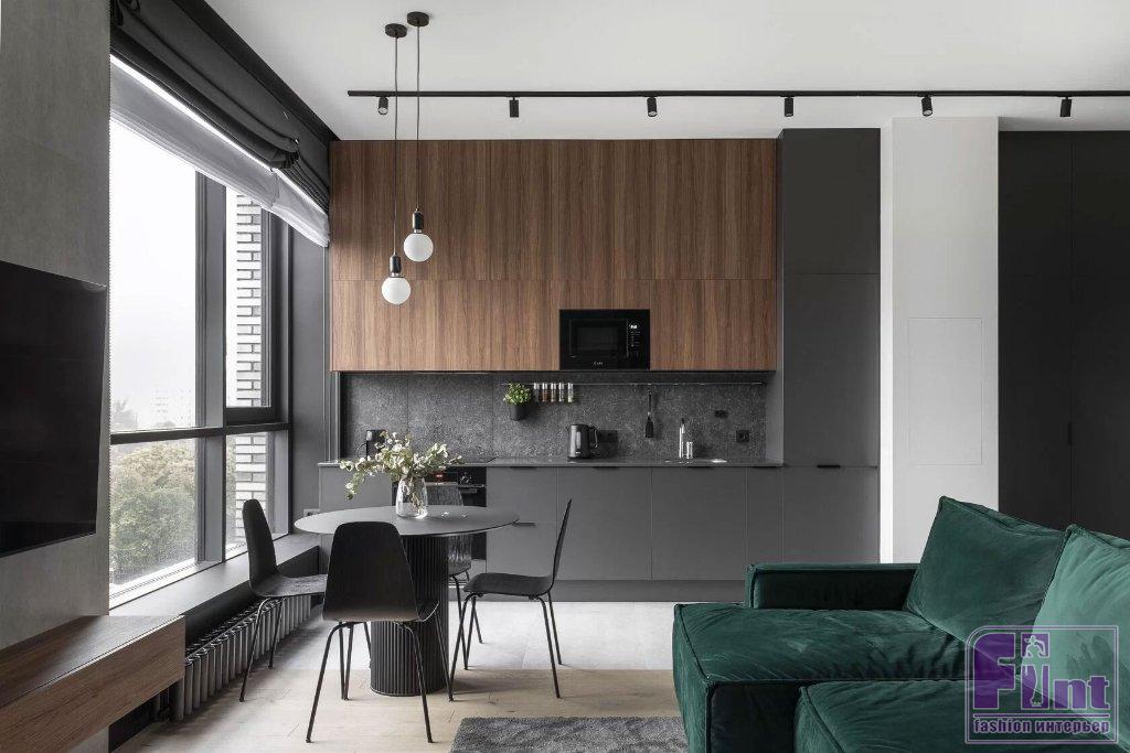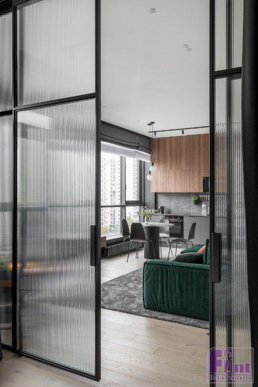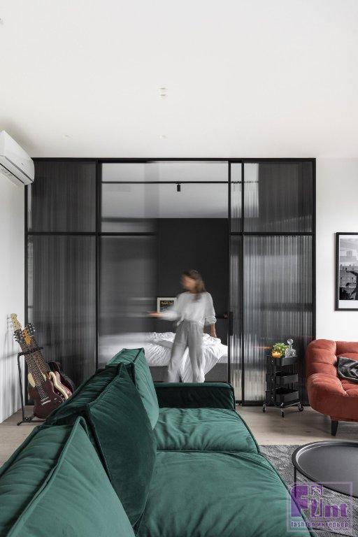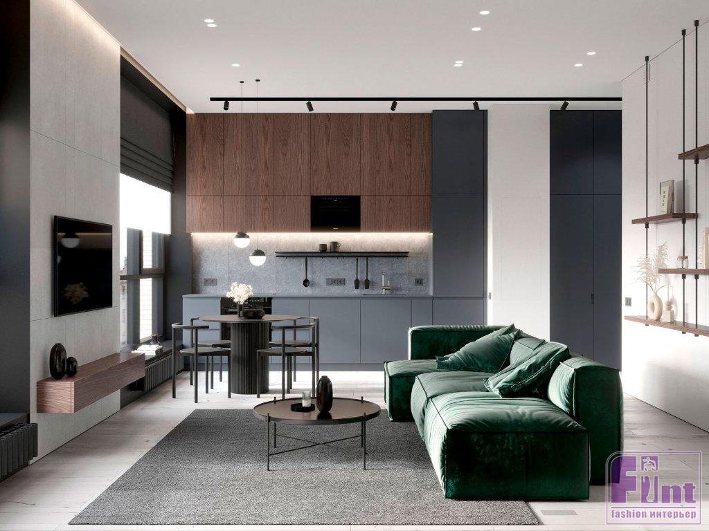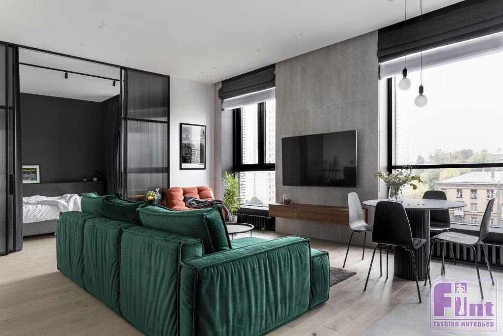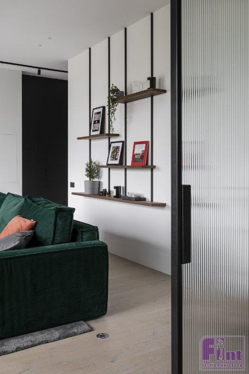 Владелица квартиры — молодая девушка. Она много времени проводит дома: работает на удалёнке, любит приглашать к себе друзей. Хозяйка обратилась к дизайнеру Екатерине Кузнецовой со следующими задачами: организовать просторную кухню-гостиную, отдельную спальню, но с возможностью объединять её с общей зоной при необходимости, большой санузел, много мест хранения, в том числе для коллекции гитар. Девушке была важна практичность интерьера, хотелось использовать белые и серые оттенки, а ещё среди пожеланий был…зеленый диван.