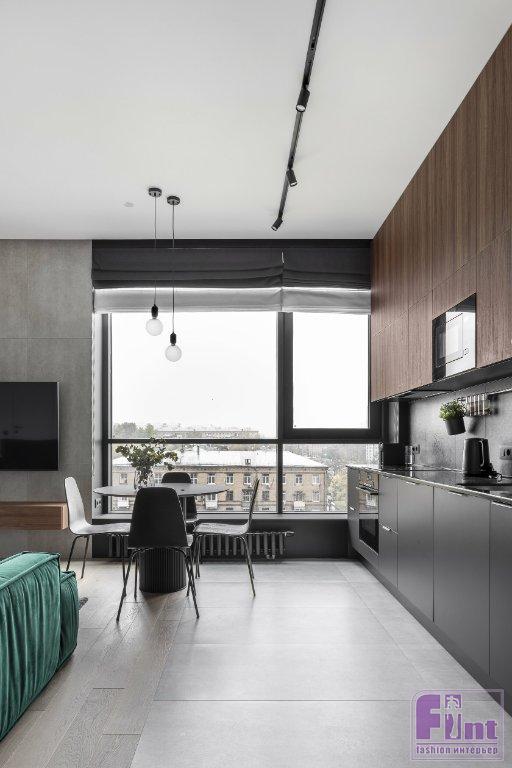 «Заказчица хотела получить максимально практичный интерьер, чем был обусловлен выбор отделки», — рассказывает Екатерина Кузнецова. Исходя из этого, и выбирали отделочные материалы: светлую краску для стен, инженерную доску серого оттенка для гостиной и спальни, серый керамогранит для пола на кухне и прихожей и тёмный графитовый керамогранит для кухонного фартука.