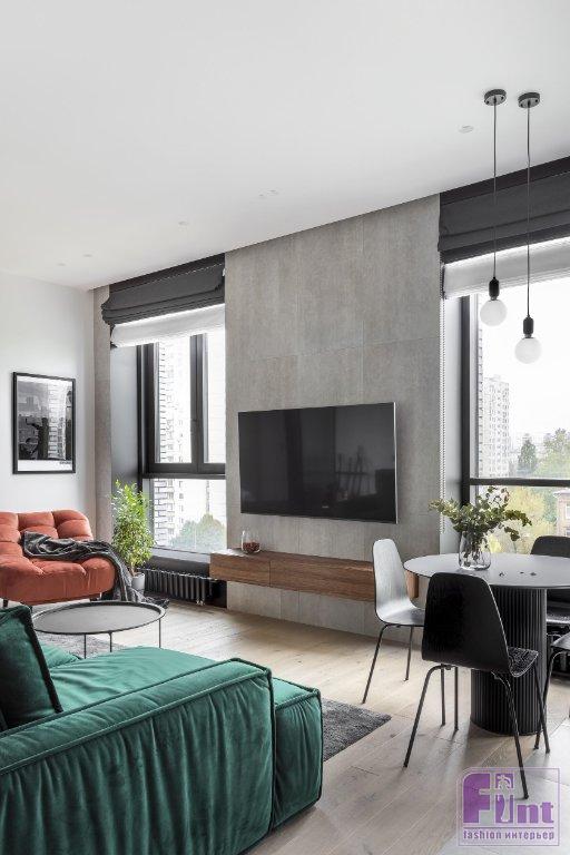 Стена за телевизором в гостиной выделена светло-серым керамогранитом, а за кроватью — краской тёмно-серого оттенка, который идеально сочетается с изголовьем кровати. Цветную краску использовали на лоджии — глубокий зелёный тон стен подобран в цвет обивки дивана. А графичными акцентами, кроме мебели и светильников, стали оконные откосы и подоконники — они чёрные.