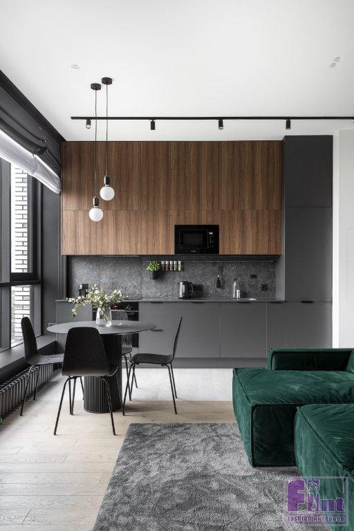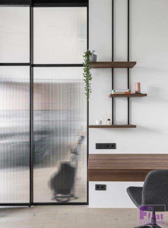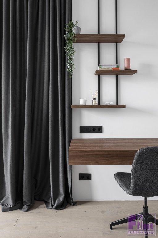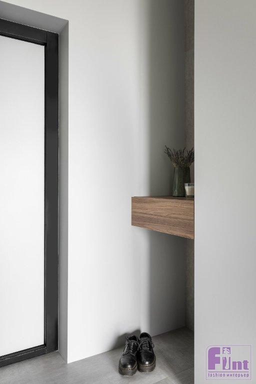 Дизайнер использовала в квартире ахроматическую цветовую гамму с добавлением оттенка натурального дерева и сочного тона обивки дивана. Пространство в стиле минимализм выглядит свободным, ритмичным и очень стильным.