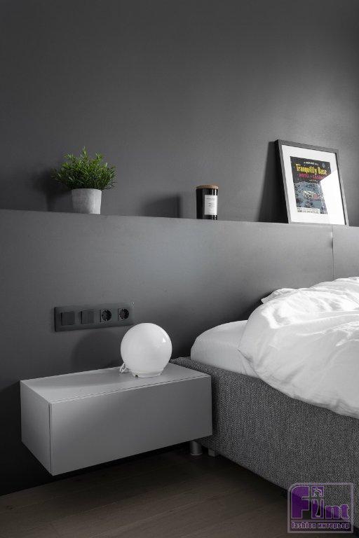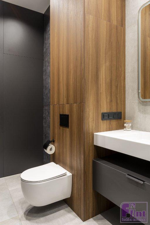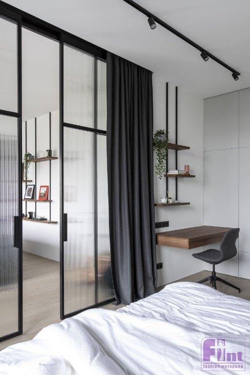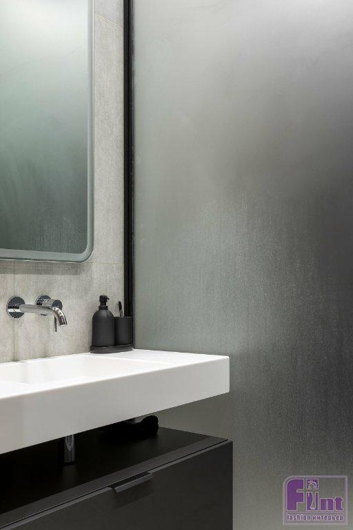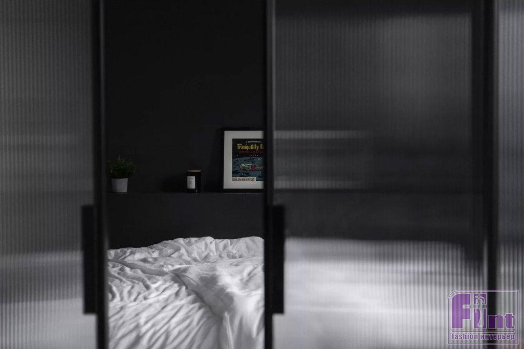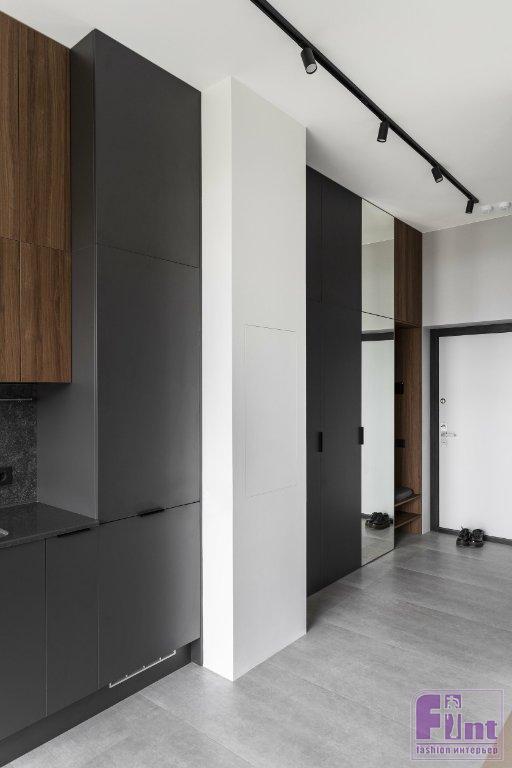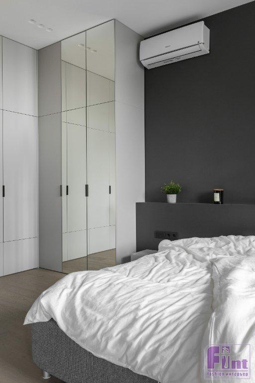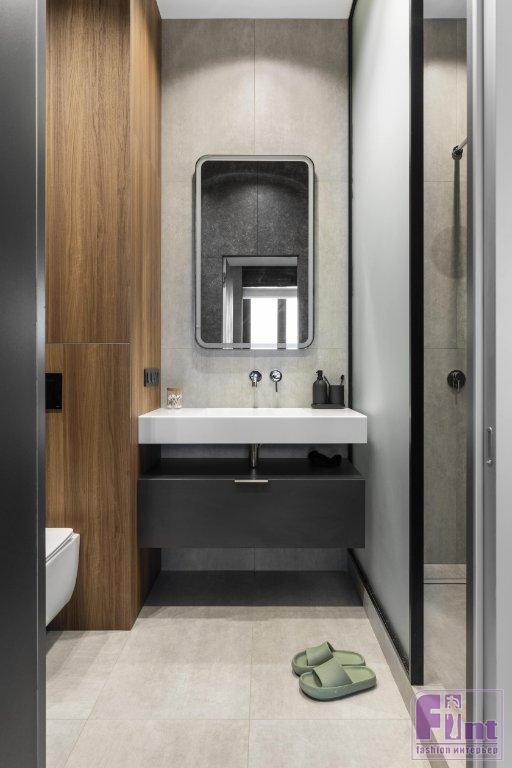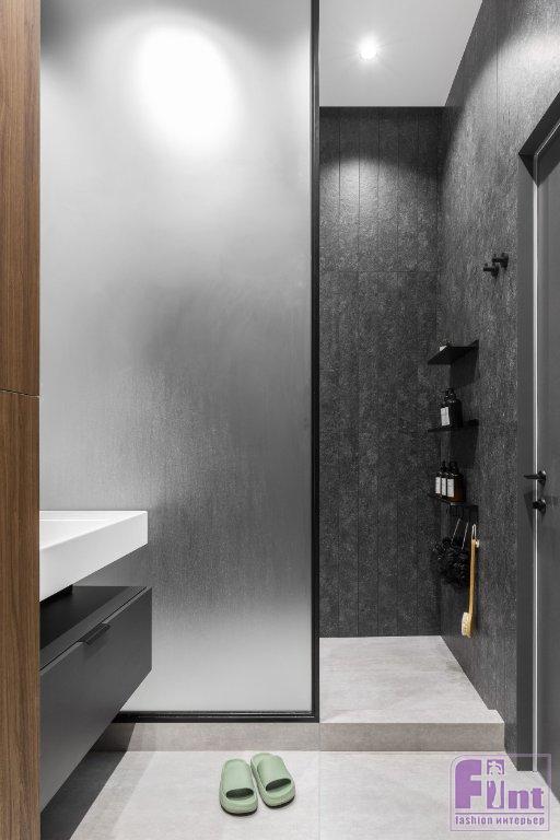 Керамогранит в ванной — тот же, что и на кухне: на полу — светло-серый, а на стенах — тёмный. Разбавляет это ахроматическое пространство фактура дерева и яркие «пятна» в виде обивки дивана и кресла в гостиной. Девушка хотела оформить много систем хранения, но от гардеробной в квартире отказались — для того чтобы оставить как можно больше свободного пространства. В спальне организовали вместительные встроенные шкафы в углу комнаты.