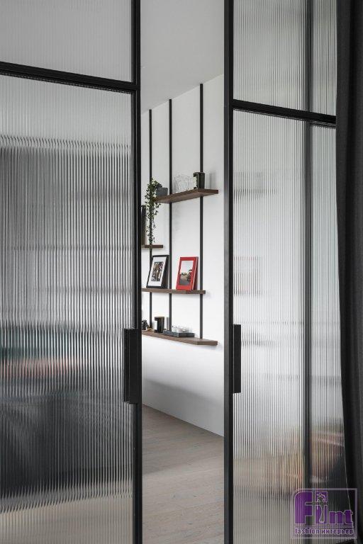 По плану застройщика это была двухкомнатная квартира с кухней, двумя санузлами и лоджией. Она сдавалась без перегородок с обозначением зон. Дизайнер, следуя задачам владелицы квартиры, предложила отказаться от глухих стен между кухней, гостиной, спальней и от коридора — по разметке застройщика выстроили только санузел, и то, объединив два санузла в одну большую ванную комнату. Остальное же пространство осталось открытым — спальню отделили от гостиной только раздвижной стеклянной перегородкой.