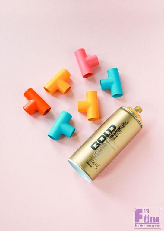 Чтобы придать нашему проекту яркий цвет в стиле поп-арт, мы решили покрасить медные тройники аэрозольной краской сочных оттенков. На самом деле, такая лестница выглядит потрясающе и с неокрашенными тройниками в натуральном медном цвете. Если вы выбрали яркий вариант, окрасьте тройники с помощью аэрозольной краски-грунтовки в два или три слоя. Для окрашивания тройников их можно подвесить на проволоке, чтобы получить удобный доступ ко всем поверхностям тройника. После окрашивания оставьте тройники до полного высыхания.