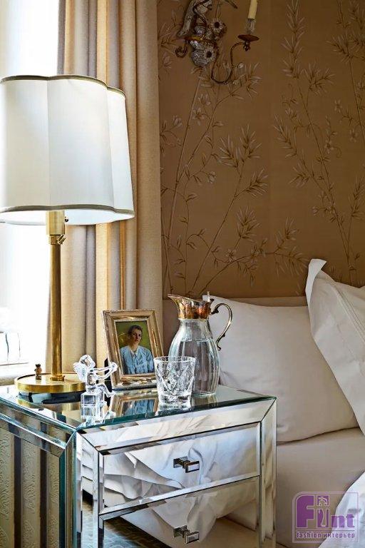 Главное место в хозяйской спальне занимает большая кровать на ножках, изготовленная из массива, у изножья которой стоит невысокая кушетка с обивкой в восточной тематике. Фасады прикроватных тумбочек декорированы гранёным зеркальным полотном. В комнате продолжается тема райских птиц на обоях, в дополнение к ним удачно подобрали бра с лампочками в виде свечей. Поскольку раньше квартира служила только в качестве запасного аэродрома, для гардеробной отвели крошечное помещение. Когда Светлана полностью переехала, оказалось, что для многочисленных вещей совершенно не хватает места. Пришлось снять небольшую квартиру на той же лестничной площадке, это был лучший выход в сложившейся ситуации.