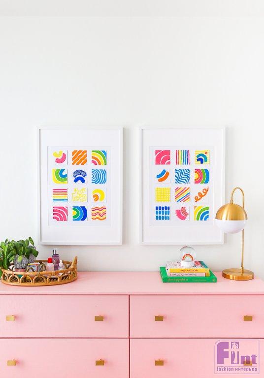После того как все ваши квадраты высохнут, сгруппируйте их в ряды и колонки, чтобы ещё раз оценить их общий внешний вид. Если потребуется, замените квадратики на более интересные с вашей точки зрения. Затем наклейте их, отмеряя равные промежутки, на чистый лист бумаги. После этого осталось лишь вставить наши панно в рамки и повесить на стену!