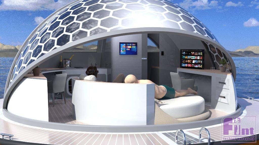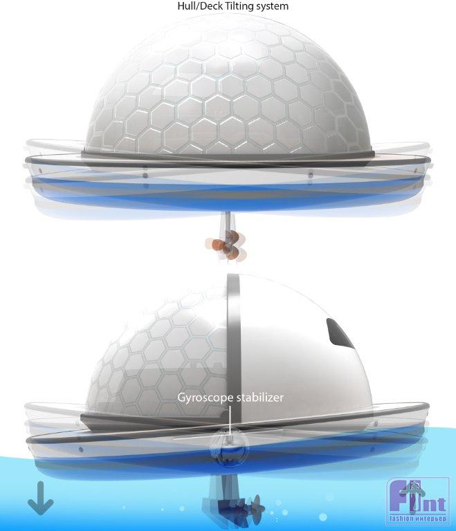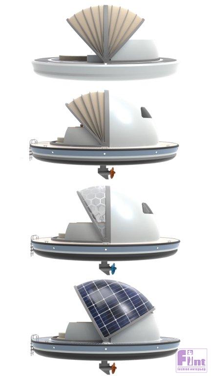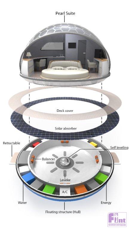 Поскольку плавающие гостиничные номера на 100% работают на солнечных батареях, они способны самостоятельно производить всю необходимую энергию для кондиционирования воздуха, освещения и бутовых приборов (холодильника, кухонного оборудования и пр.). Вместе с тем особое хранилище в корпусе способно без труда вместить дополнительные резервные источники питания и другие необходимые технические компоненты и системы. Более того, плавучие люксы, по замыслу дизайнера, могут быть оснащены системой устойчивости при качке на основе гироскопа или генератором водорода на топливных элементах для выработки энергии на борту, обеспечивая функциональность гостиничного номера даже в пасмурные и дождливые дни.