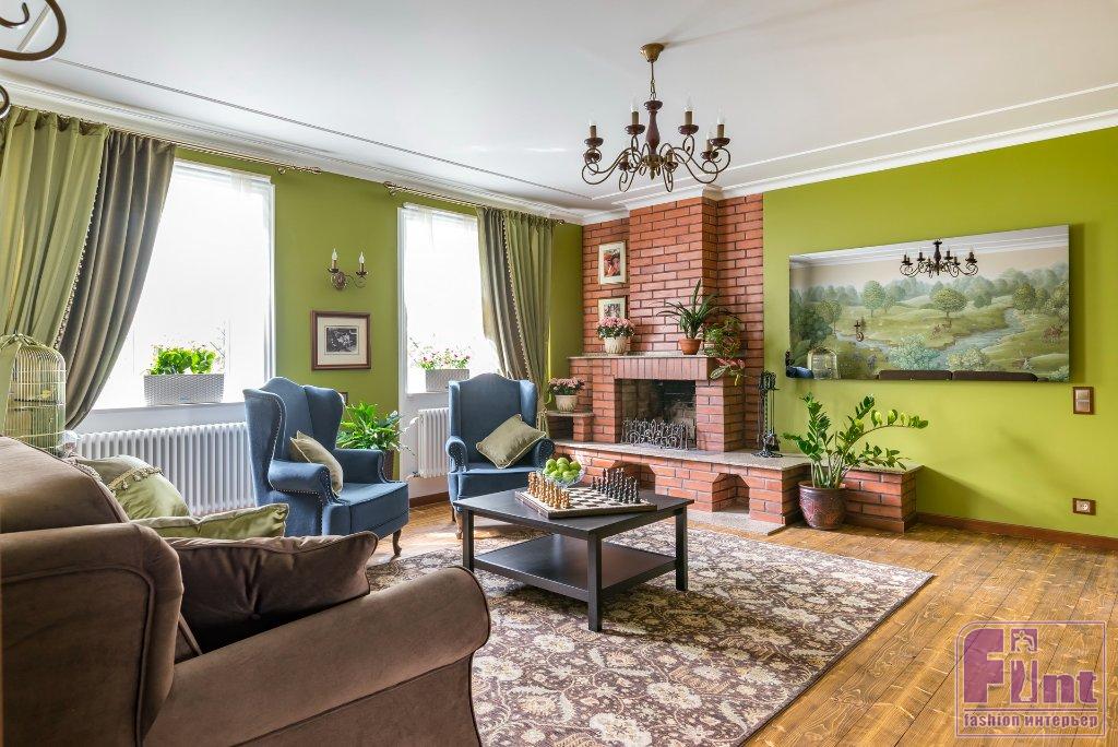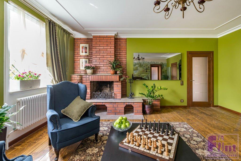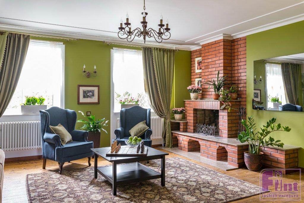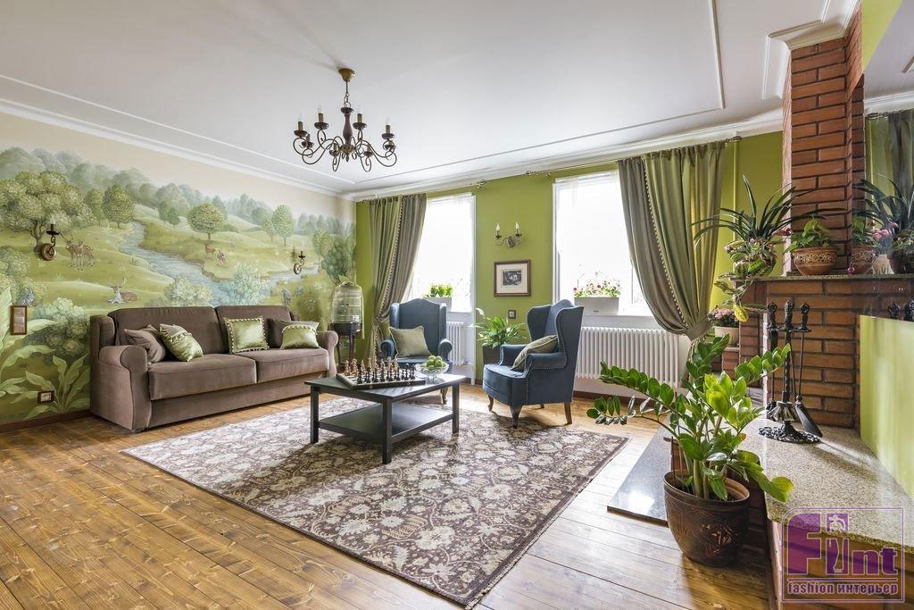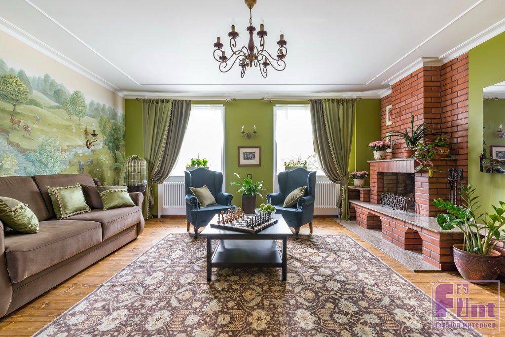 Главной достопримечательностью гостиной является камин. Его проектировал отец Светланы Зейналовой. Дизайнеры решили оставить его на месте, немного обновив. Стены покрасили краской на водной основе, её цвет напоминает листья молодого шалфея. Отдельное пространство выделили под фрески с флористической темой росписи. Подобные покрытия украшали дома европейцев еще в шестнадцатом и семнадцатом веках.