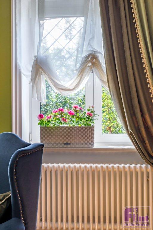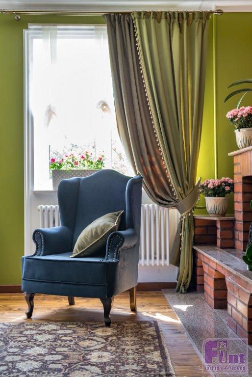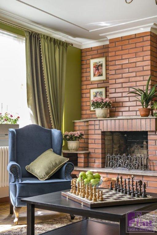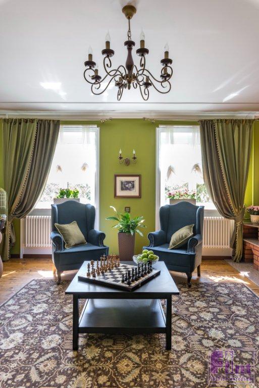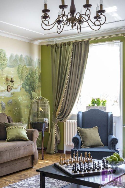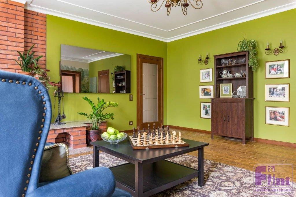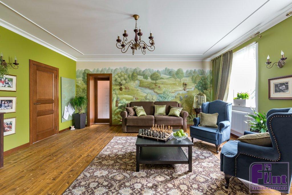 Главной достопримечательностью гостиной является камин. Его проектировал отец Светланы Зейналовой. Дизайнеры решили оставить его на месте, немного обновив. Стены покрасили краской на водной основе, её цвет напоминает листья молодого шалфея. Отдельное пространство выделили под фрески с флористической темой росписи. Подобные покрытия украшали дома европейцев еще в шестнадцатом и семнадцатом веках.