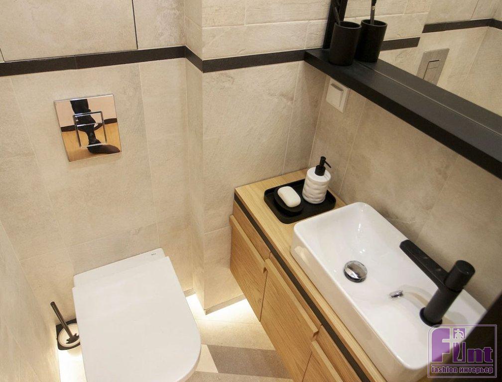 Идея сочетания материалов, которое выглядит эффектно даже с бюджетной отделкой — комбинация белой сантехники и чёрного смесителя, который хотя и стоит дороже, но позволяет сэкономить более внушительные суммы на простой плитке.
