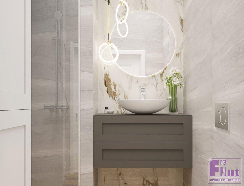 «Чтобы интерьер выглядел дорого, выбирайте крупноформатный керамогранит для отделки всей ванной, это смотрится очень эффектно. А стоимость российской плитки в три раза меньше итальянской. На примере нашего проекта также видно, что можно сэкономить на натуральном мраморе, выбрав широкоформатный керамогранит», — советует Александра Гартке.