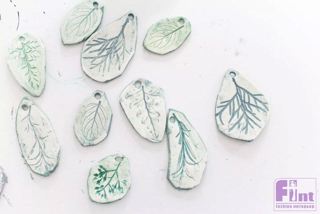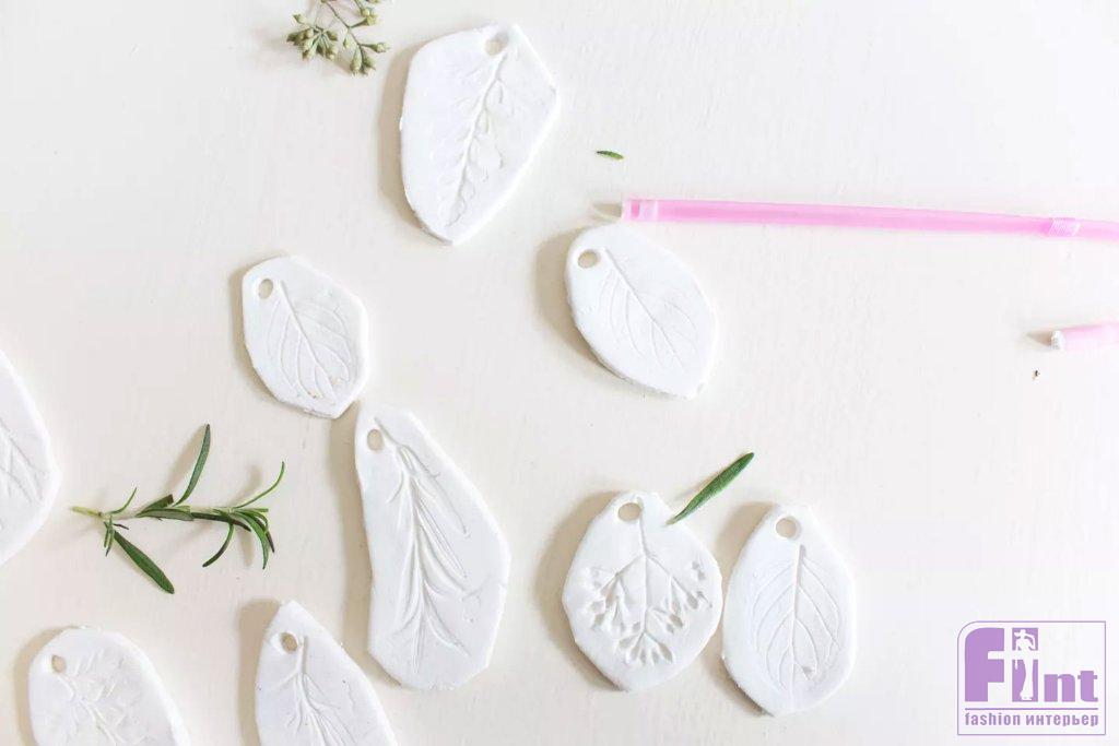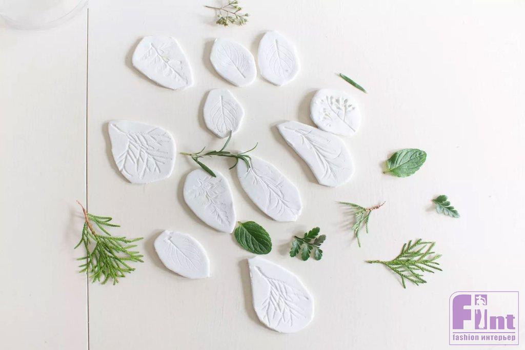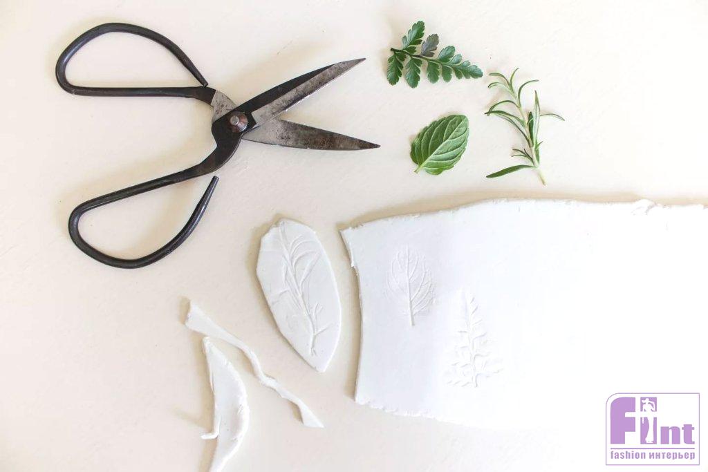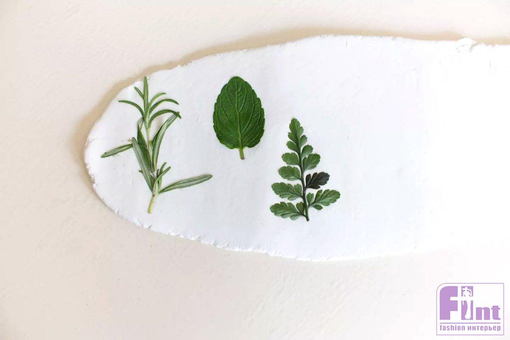 Положите шарик глины на рабочую поверхность и раскатайте его скалкой до желаемой толщины. Мы решили делать глиняные элементы толщиной примерно 2-3 мм. Выберите красивые листья или веточки и вдавите их в сделанную заготовку, убедившись, что ботанические элементы оставляют хорошо различимый отпечаток в глине.