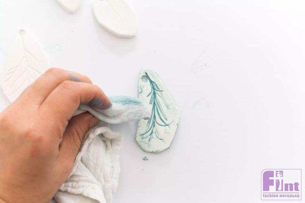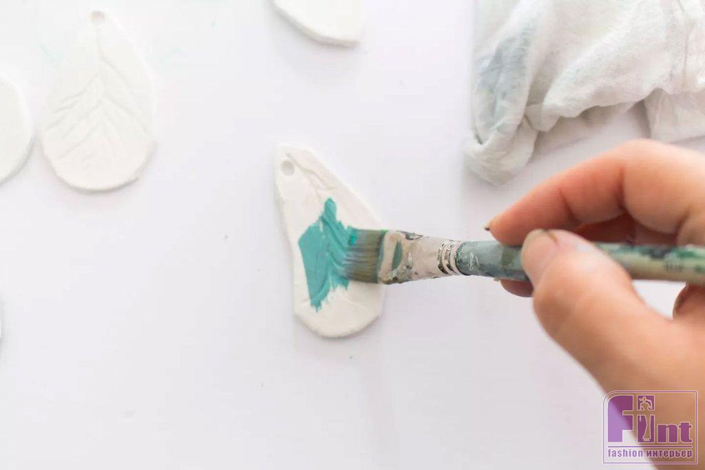 Как только глина полностью высохнет или запечется, используйте кисть и нанесите на лицевую часть заготовок лёгкий слой краски нужного цвета, убедившись, что он заполняет углубления отпечатка.