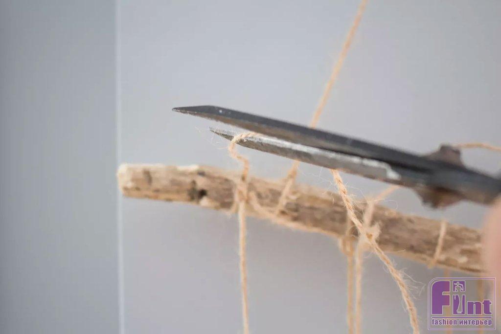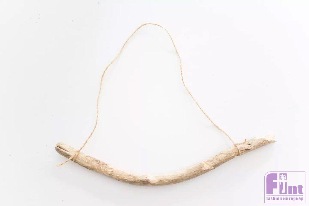 Возьмите кусок джутового шпагата или хлопчатобумажной верёвки подходящего диаметра и сделайте петлю для подвеса вашего изделия, завязав узлы шпагата на концах сухой ветки.