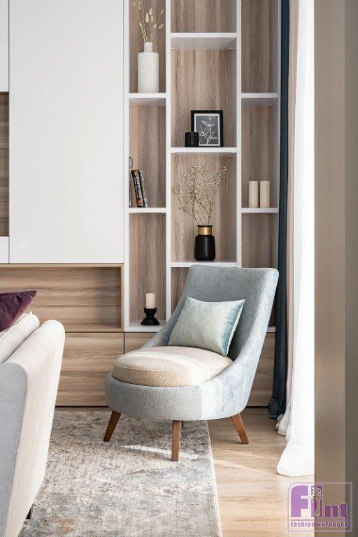 В гостиной спроектирована «стенка» с телевизором — в закрытых полках могут спрятаться посуда, домашний текстиль, на открытых — стоять книги или декор. Г-образный кухонный гарнитур — вместительная система хранения для всей нужной техники и кухонных принадлежностей. В спальне хранение организовано рядом с кроватью. Вместо стандартных тумбочек установили шкафы с открытыми полками на торцах — на эти полки можно положить разные мелочи и использовать вместо прикроватных столиков. Напротив кровати — подвесная тумба со столиком. Также шкафы запланировали на балконе.