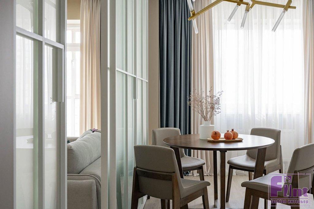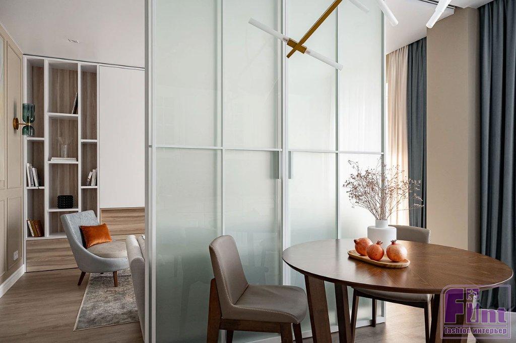 Изначально это была стандартная двухкомнатная квартира достаточно большой площади — 66 квадратных метров. В распоряжении хозяев — два балкона, из спальни и из гостиной. Квартира предназначается для проживания двух людей, и дизайнер предложила сформировать общую зону с максимальным комфортом. Было решено убрать глухую стену между кухней и гостиной, заменив её раздвижной перегородкой с матовым стеклом. Такое решение обеспечило доступность телевизора из кухни, как того и хотели хозяева. Кроме того, гостиную изолировали от прихожей, сделав вход в общую зону только на кухне. Спальня осталась изолированной, в другой стороне квартиры. Таким образом, у супругов образовалась общая зона, где можно проводить время и принимать гостей, а также приватный блок.