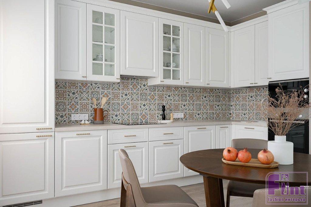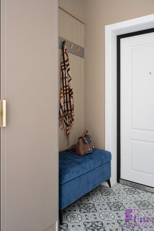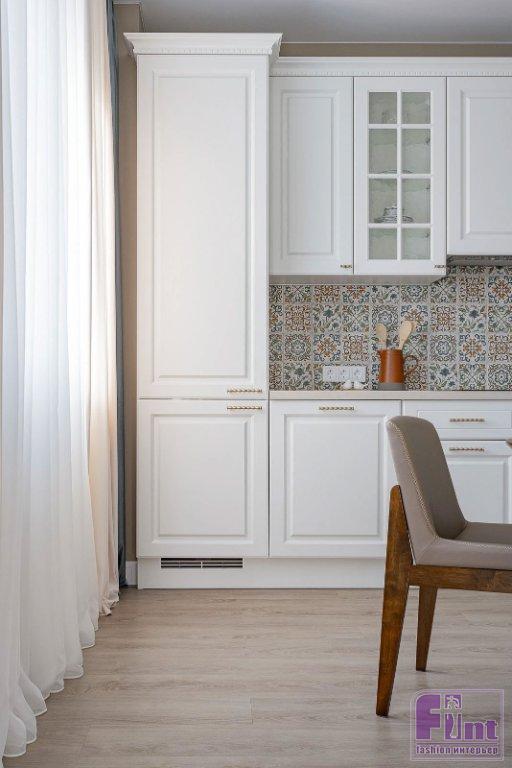 Кухонный фартук оформлен мелкой плиткой с рисунком в стиле пэчворк, который удачно контрастирует с белыми фасадами гарнитура. Прихожая, общая зона и спальня выполнены в спокойных оттенках: беж, пастельный голубой. Балконы же и санузел — более насыщенные по цвету. Так, на балконе при гостиной использовали жизнерадостный оранжевый тон, на балконе при спальне — активный бирюзовый. В прихожей установили вместительный шкаф для верхней одежды, обуви и хозяйственных вещей — гладильной доски, пылесоса.