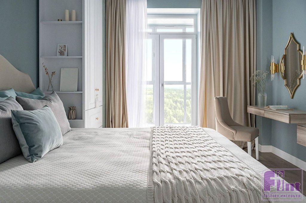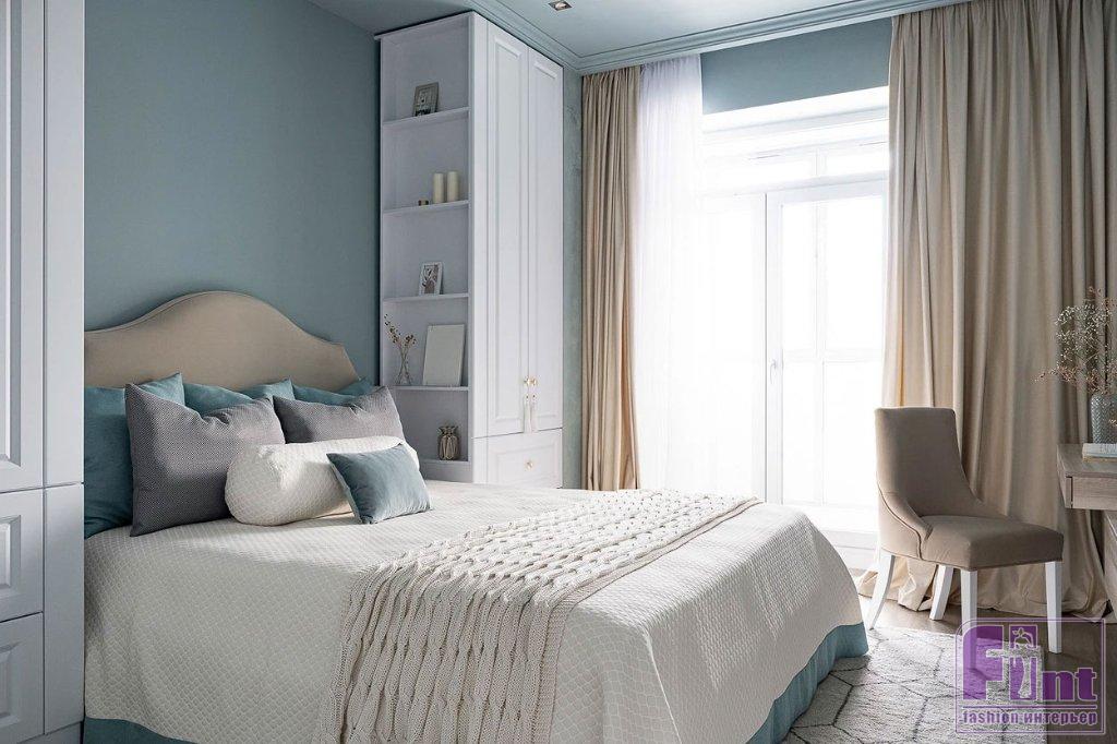 Для отделки стен во всех зонах выбрали экологически чистую интерьерную краску. В спальне добавили акцента с помощью фрески, которая украсила стену рядом с кроватью, напротив окна. На кухне и в гостиной окраска стен разбавляется молдингами. На балконе при спальне также использовали декоративную штукатурку с выраженной фактурой, которая добавила этой зоне нужного настроения.