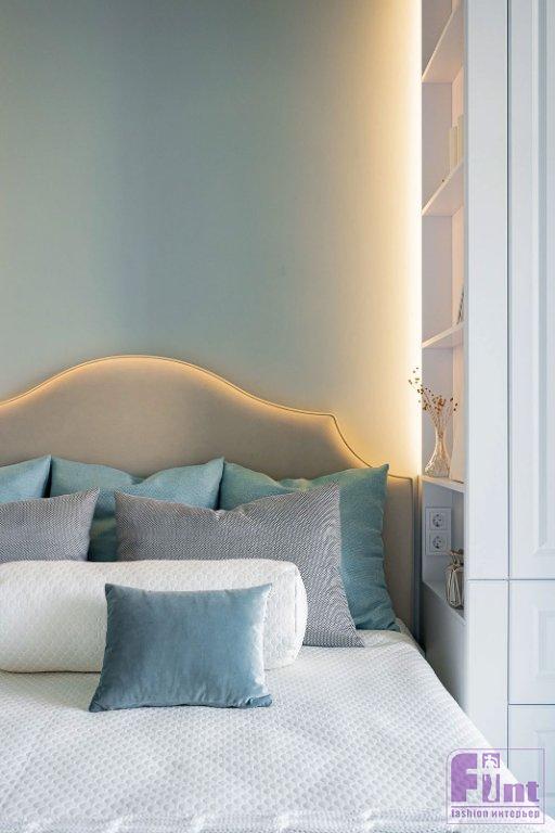 Свет в проекте решён по стандартным сценариям: общий и дополнительный. В кухне-гостиной на потолке смонтированы встроенные светильники, дополнительно реализована подсветка штор, рабочей поверхности (работает от сенсорного выключателя), телевизионной зоны, есть бра на стене. Обеденную зону украшает крупная дизайнерская люстра. В спальне точечные потолочные светильники дополняются подсветкой шкафов, которая играет роль ночного прикроватного освещения. У туалетного столика — отдельное бра.