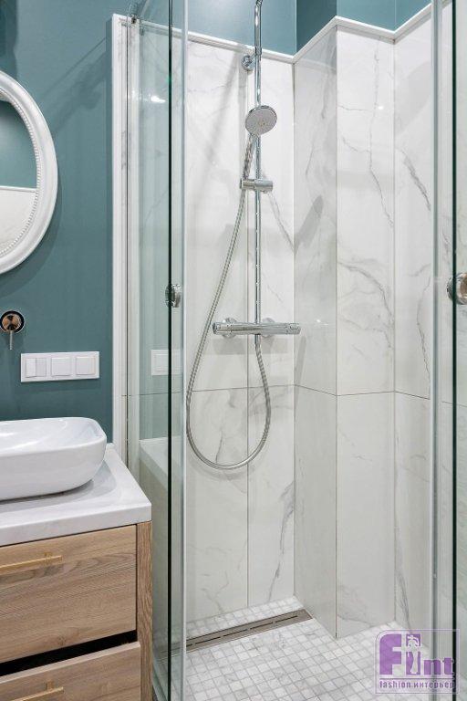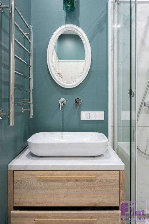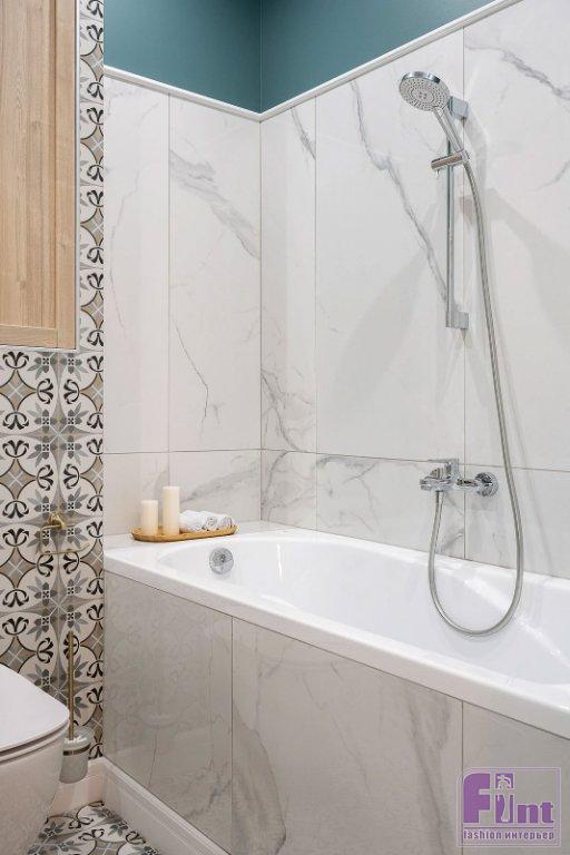 Пол в жилых комнатах и на кухне выложен кварцвиниловой плиткой под дерево. Для прихожей и балконов выбрали плитку с рисунком, что позволило сделать акцент на напольном покрытии и добиться нужной декоративности. В ванной комнате — традиционная комбинация плитки и краски на стенах. Использовали насыщенный бирюзовый цвет краски и несколько видов плитки: «базовую» под мрамор и с рисунком. Отделку удалось удачно и весьма гармонично сочетать.