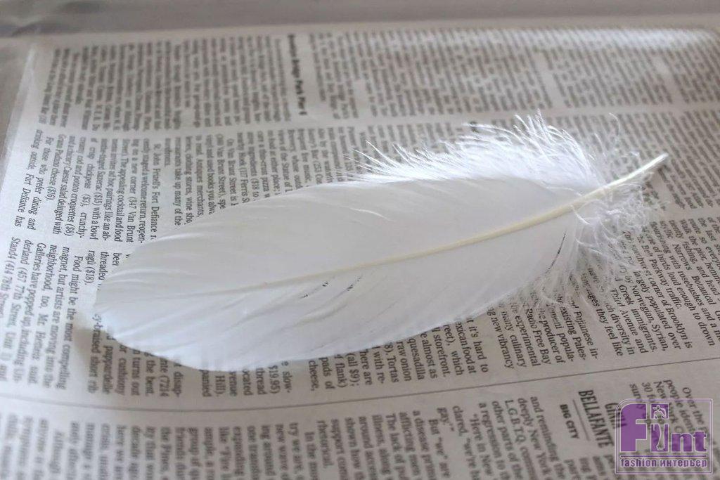 Застелите своё рабочее место какой-нибудь старой газетой или подходящей бумагой. Положите белое перо на газету и определите, какая сторона пера является лицевой. Настоящие гусиные перья имеют небольшой естественный изгиб, и лицевая сторона пера выпуклая. Это означает, что перья изгибаются кончиками внутрь, в то время как центр пера изгибается наружу. Вы можете покрасить обе стороны пера, но достаточно покрасить лицевую сторону, особенно для этого DIY проекта настенного искусства.