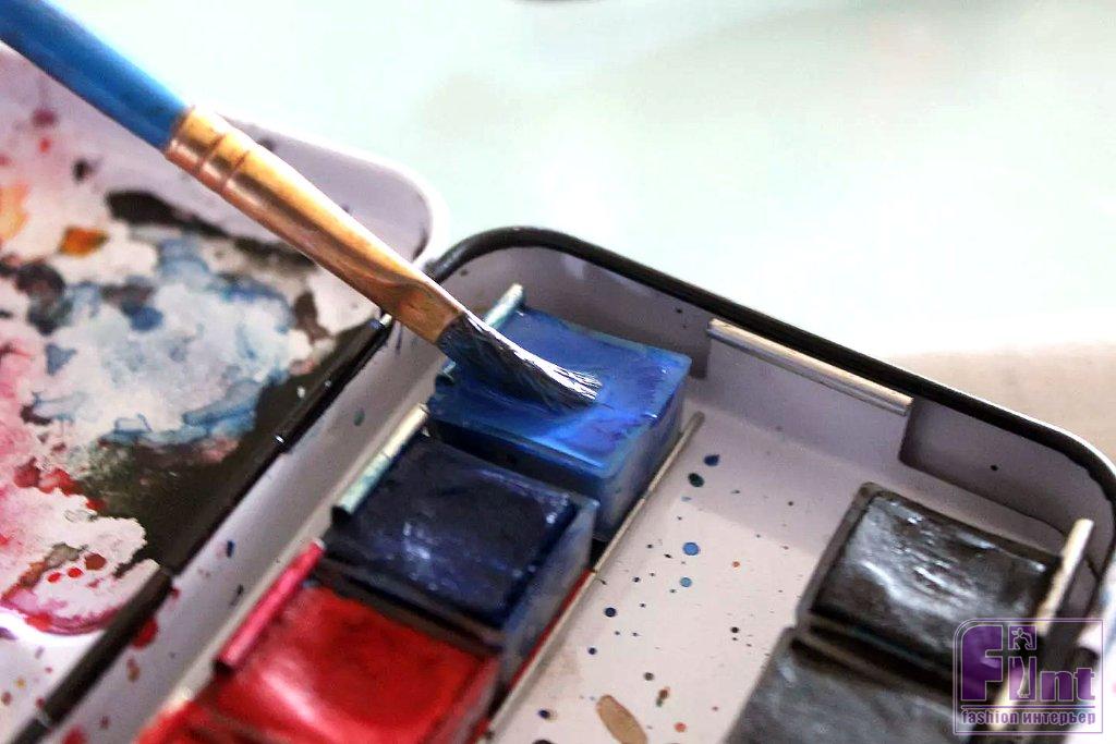 Смочите художественную кисть среднего размера водой и окуните влажную кисть в краску выбранного цвета.