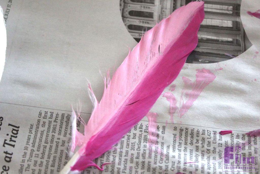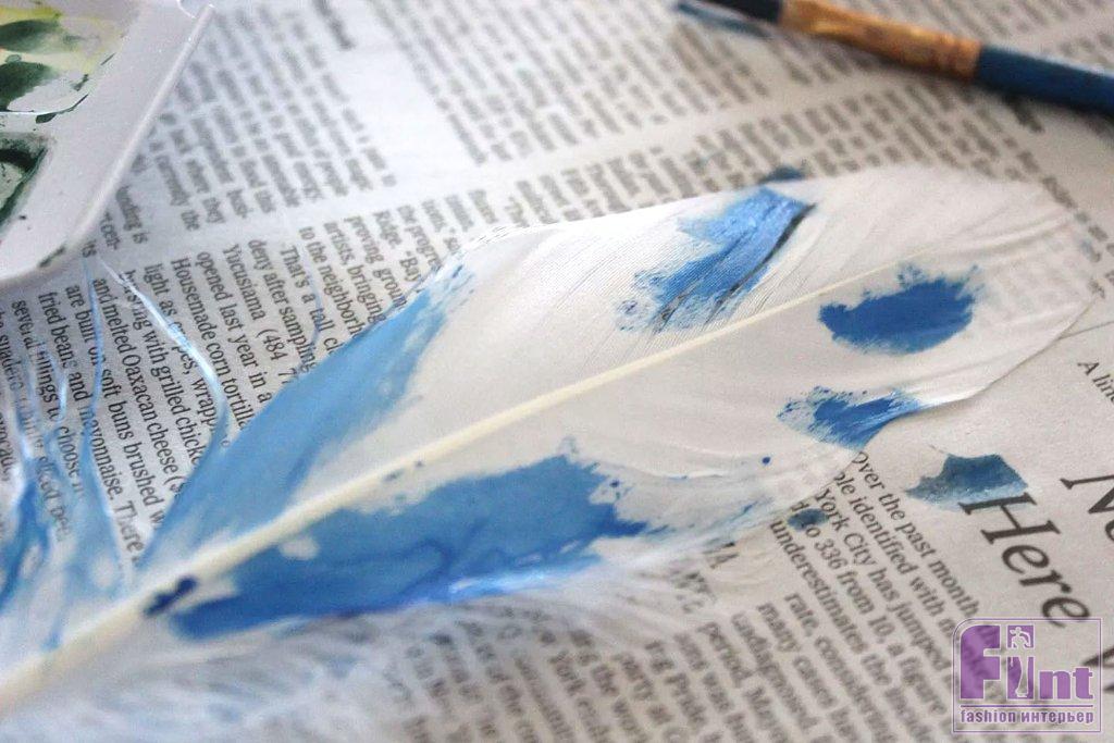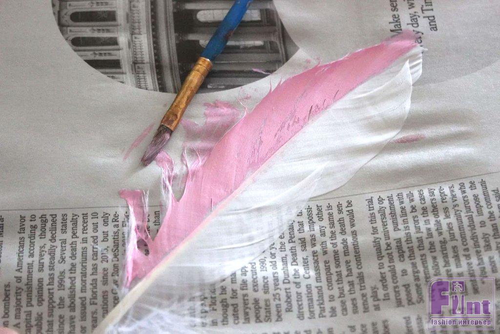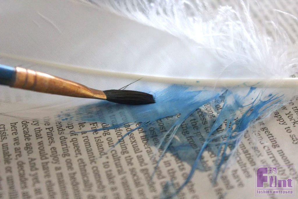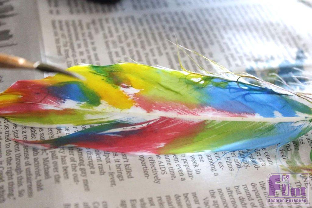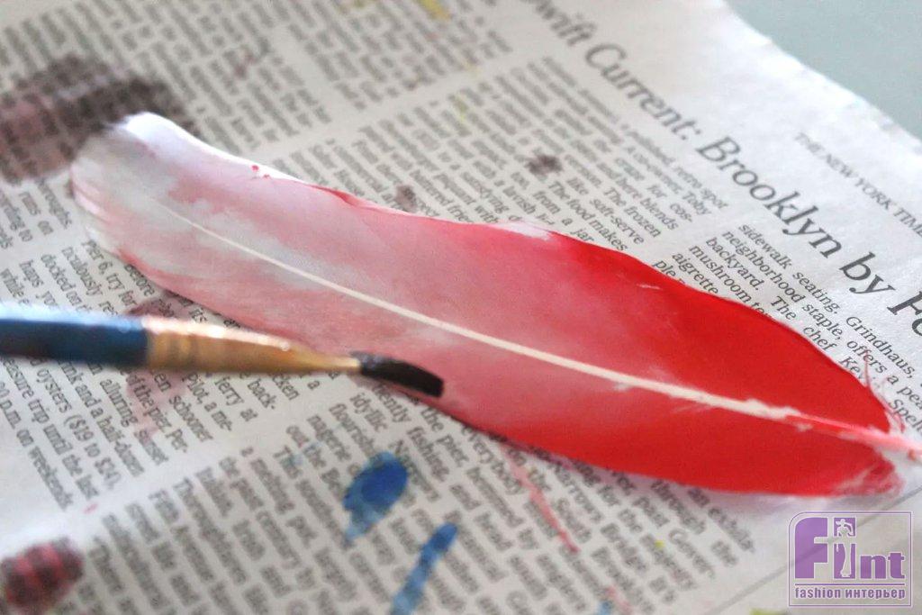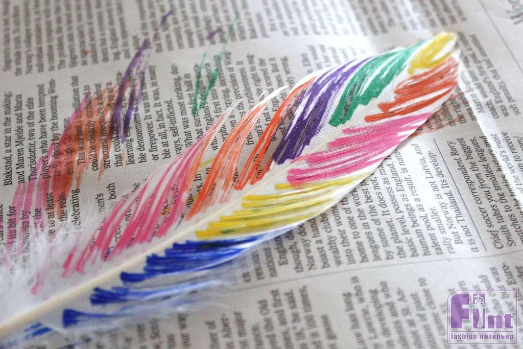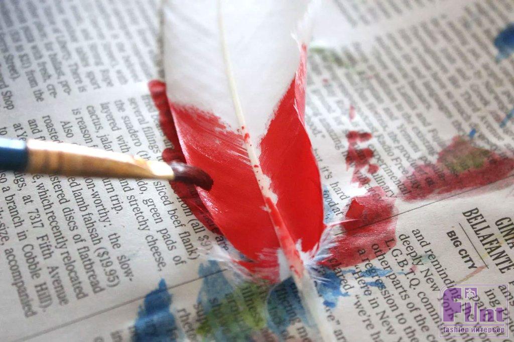 Прижимая перо за его кончик плашмя к газете, нанесите краску кисточкой на перо. Рисуйте в направлении «волосков» перьев – от стержня к краям. Слегка прижимая перо кисточкой к газете, вы сможете лучше наносить краску. Не забудьте окрасить распушённые части пера у его основания.