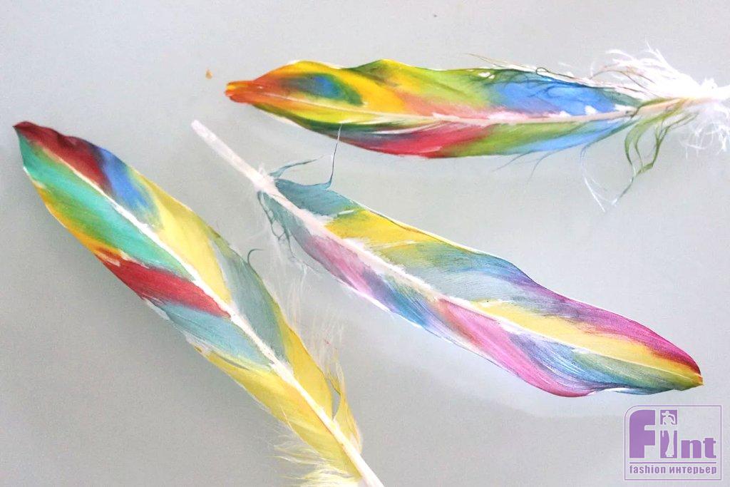 Покрасьте несколько перьев, каждое в два оттенка разных цветов. Они выглядят почти как пробники краски, которые можно увидеть в специализированных магазинах строительных и отделочных материалов.