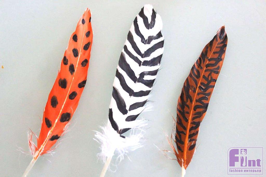 Акриловые краски также отлично подходят для нанесения на перья различных узоров и орнаментов. Мы нарисовали принты в стиле анимализм, которые легко можно воспроизвести на перьях, потому что непрозрачная природа акрила позволяет накладывать цвета, не смешивая их.