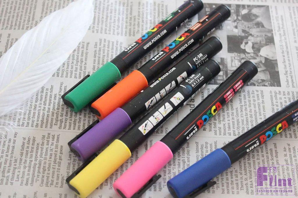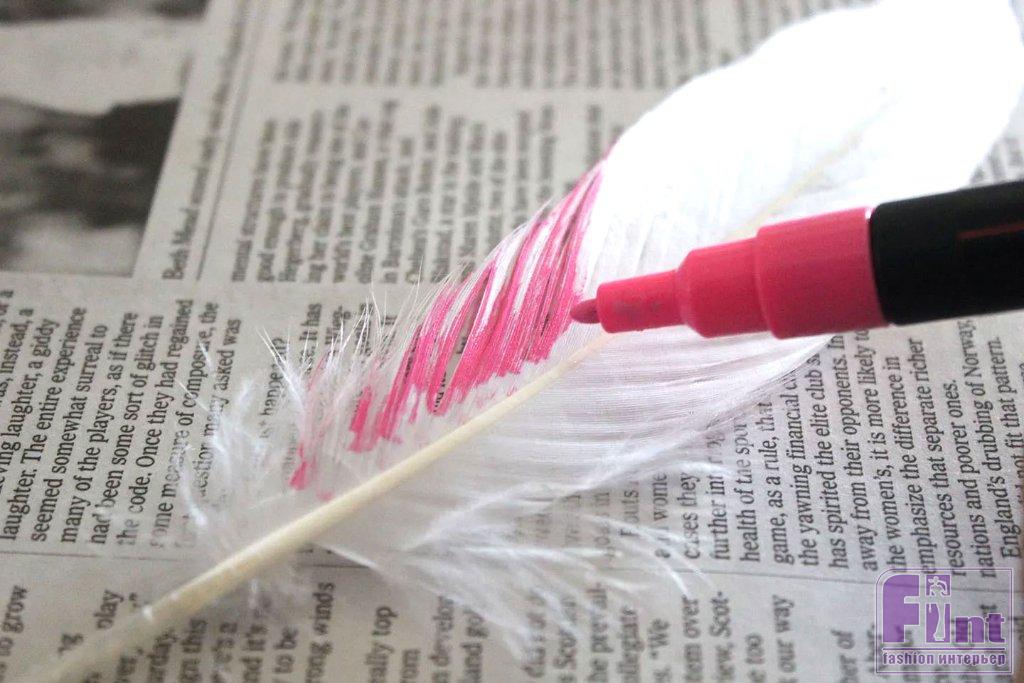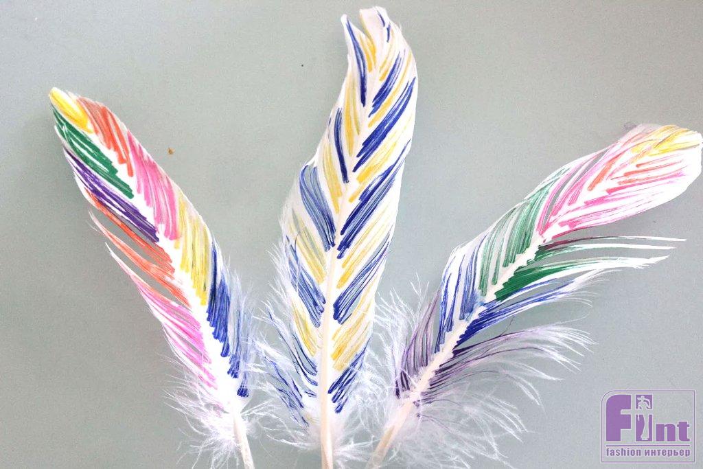 Современные маркеры для рисования отличаются простотой в использовании и насыщенными матовыми цветами, схожими с акриловой краской. Для людей, которые боятся рисовать, эти маркеры действительно меняют правила игры. Они также идеально подходят для детских поделок. Однако при использовании маркеров следует иметь в виду два недостатка. Очень трудно добиться полного покрытия изделия маркером, а это означает, что часть перьев останется белой. Это не обязательно плохо, и на самом деле белый цвет помогает подчеркнуть другие цвета. Ещё одним возможным недостатком маркеров является то, что рисование маркером может расслаивать однородную структуру пера. Опять же, это можно рассматривать как плюс, поскольку разделённые «волоски» опахала пера приводят к расширению и увеличению его размеров.