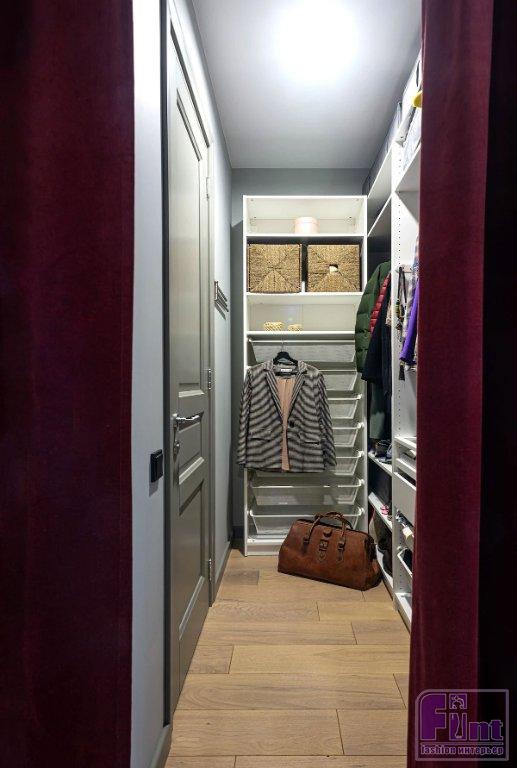Так, за счёт прихожей немного расширили кухню, это позволило вписать встроенные шкафы-колонны с техникой. В спальне хозяев гардеробную немного уменьшили, сделали её более правильной формы, это позволило увеличить спальню. Дверь в ванную комнату, которая находится при спальне, развернули в гардеробную. Так получилось избежать «коридорного» ощущения с большим количеством дверей. К тому же вход в саму гардеробную оформлен шторами. С гардеробной во второй комнате (сейчас это кабинет, будущая детская) поступили иначе. Вход был из спальни, а его сделали из прихожей. Так помещение стало кладовой, к нему есть доступ у всех членов семьи.
