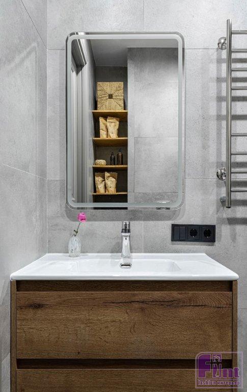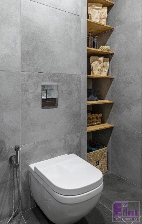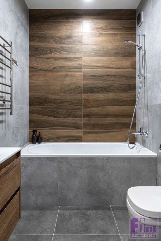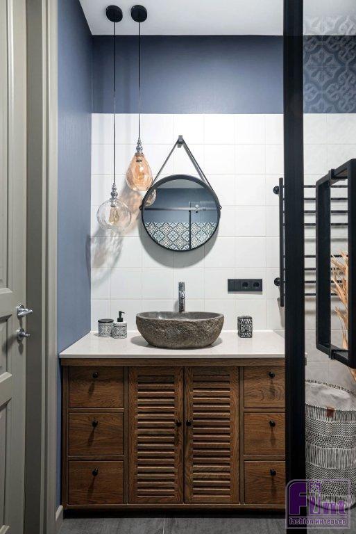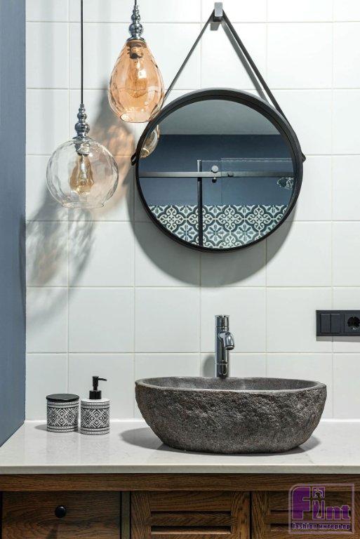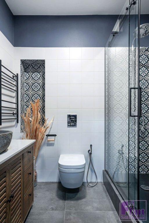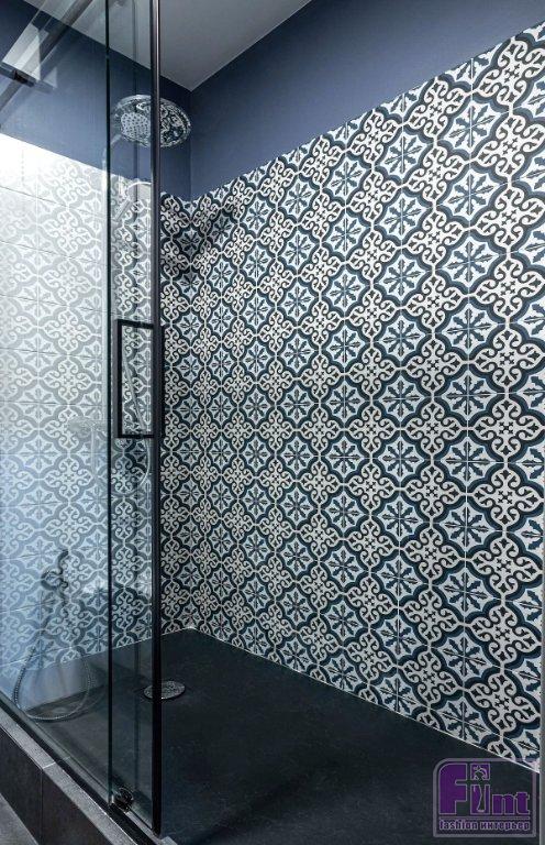 Ванная комната и душевая — тоже в плитке, но разной. Так, для душевой, которая примыкает к спальне хозяев (они хотели именно душ) скомбинирована светлая квадратная плитка и яркая, с узором. Последняя украшает именно зону душа и нишу, которую оставил застройщик. Таким решением нишу выделили, её используют для декоративных композиций. Верхняя часть стены окрашена в цвет узора на плитке. Ванная планировалась и для гостей, и для детей — там скомбинировали плитку под бетон и дерево: лаконично, но стильно и универсально.