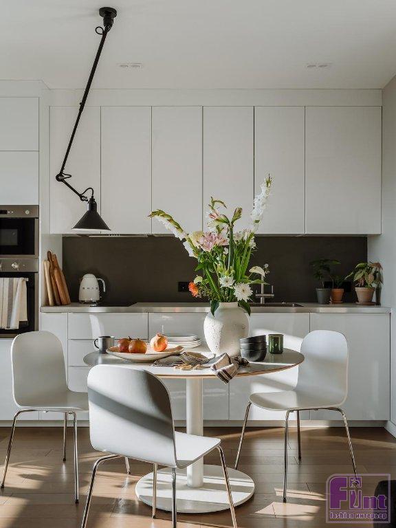 Кухонный гарнитур собран из готовых модулей стандартного размера. «При проектировании мы всегда делаем ниши для готовой мебели с учетом минимальных зазоров, чтобы создать впечатление «встройки» на заказ», — говорит дизайнер. Подвесной светильник над обеденной зоной можно поворачивать и двигать с учётом расположения стола, что очень удобно и придаёт интерьеру особенный штрих. Это так называемая Lampe Gras авторства французского инженера Бернара-Альбина Гра. Сегодня его лампы украшают квартиры, студии, мастерские по всему миру. Кухня продолжается линией высоких шкафов на лоджии, там хранятся хозяйственные принадлежности и сезонная одежда хозяйки квартиры.