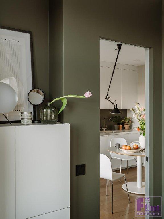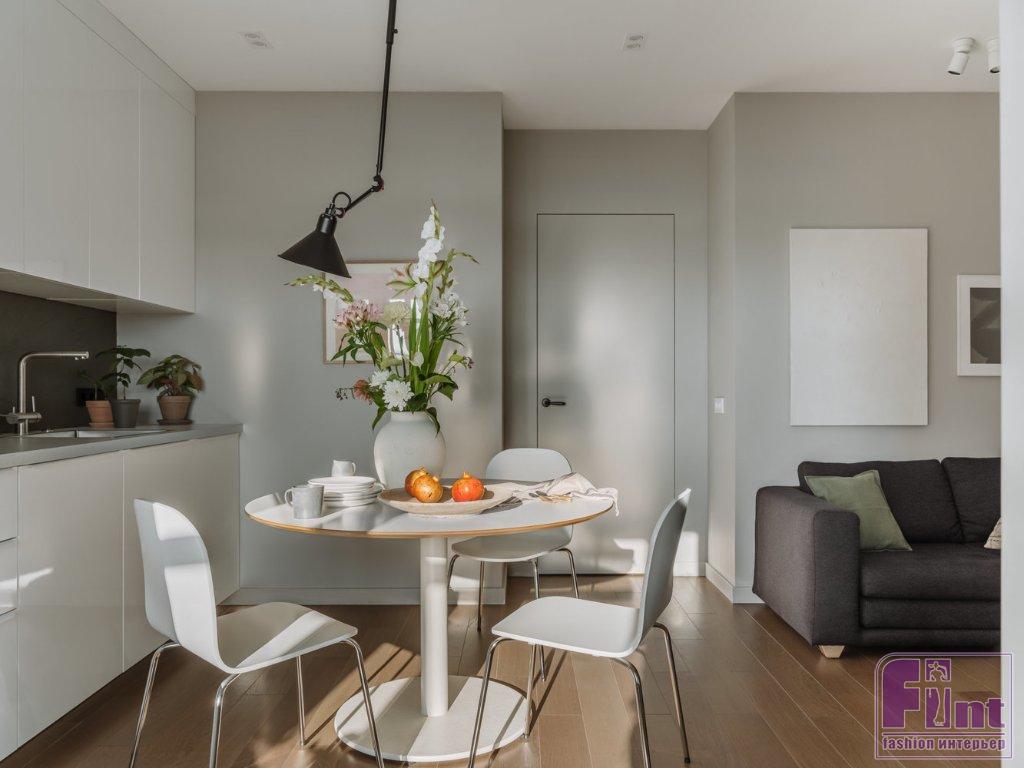 В гостиной за фасадами шкафов спрятали небольшое рабочее место, внутри сделаны выводы для подключения игрового компьютера с возможностью переключения видеосигнала на телевизор. Так, большой монитор и системный блок не портят визуальную чистоту интерьера гостиной в маленькой квартире. Все стены в квартире выкрашены экологически чистой интерьерной краской в деликатный оттенок светло-серого цвета, и только в спальне дизайнер применила более насыщенный серый оттенок с зелёным компонентом. На полу положена инженерная доска российского производства.