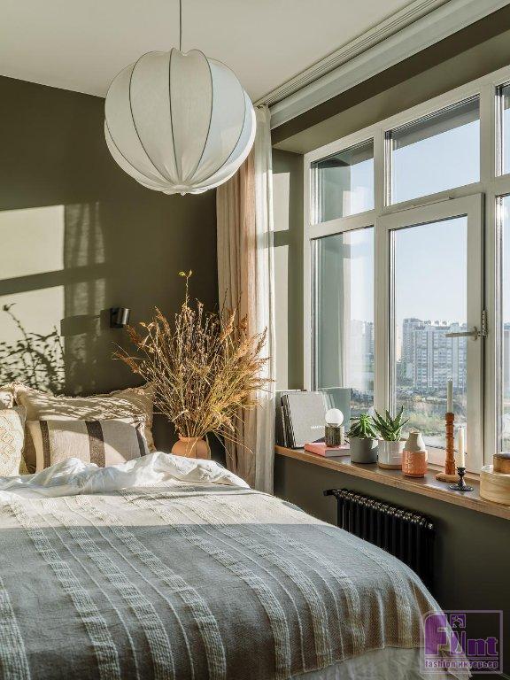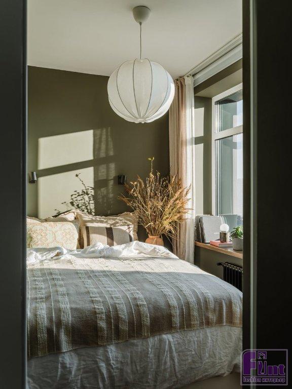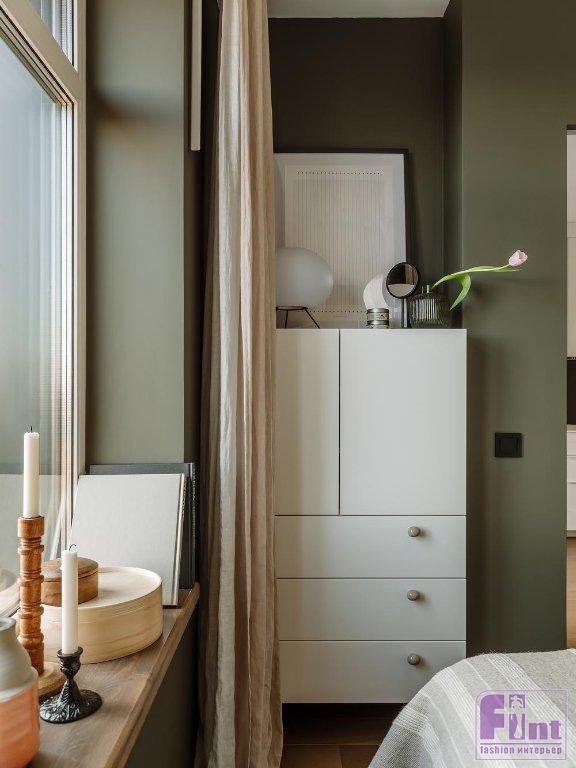Спальня получилась компактной, но очень уютной. В спальне есть высокий комод с выдвижными ящиками — его собирали из готовых каркасов и фасадов, которые купили в магазине. Широкий подоконник в спальне оформлен в тон напольному покрытию — в натуральном цвете светлого дерева. В качестве основных мест хранения одежды выступают вместительные шкафы в небольшой прихожей.