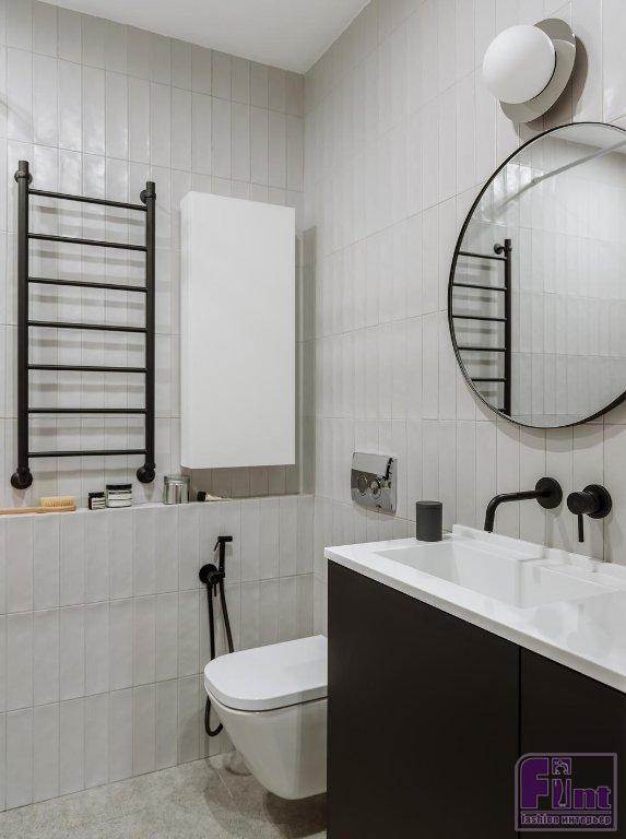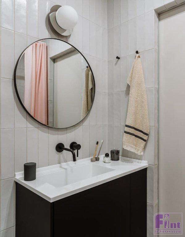 Ванная комната традиционно облицована керамической плиткой. В отделке сочетаются нейтральные оттенки, белый, черный и хромированные детали. Тумба под умывальником сделана из готовых модулей кухни — размер помещения позволял поставить только раковину небольшой глубины в 40 см. Столешница раковины выполнена из долговечного и прочного акрилового камня.