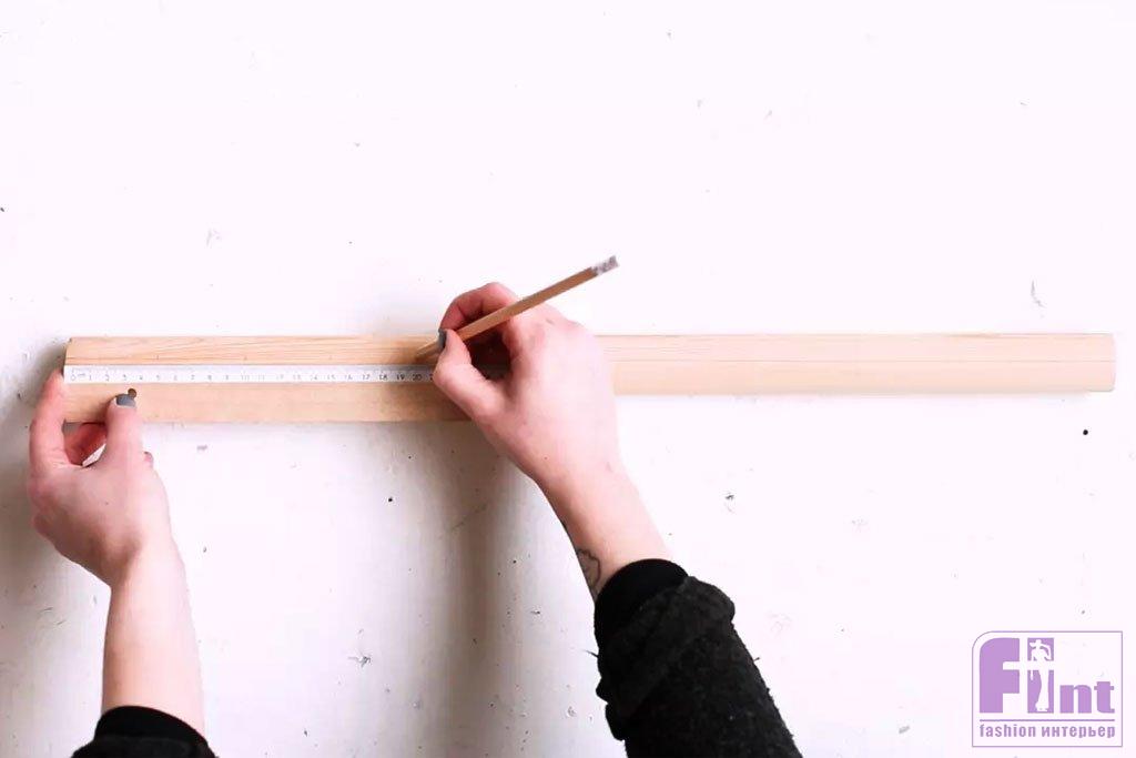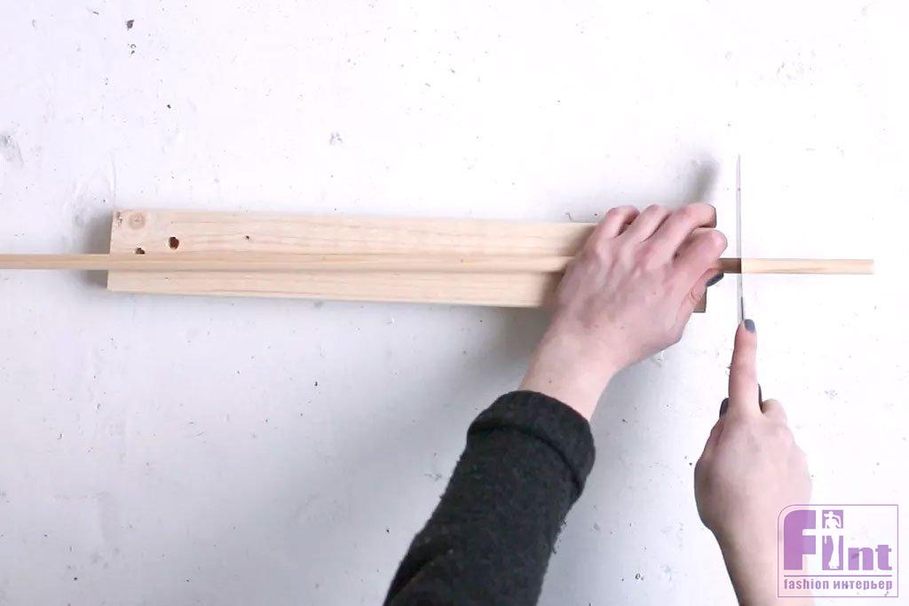 Измерьте пространство, в которое вы планируете установить будущую стойку для обуви. Округлите значение до сантиметров и отрежьте шкант диаметром 25 мм по этому размеру. Проведите прямую линию по длине отрезанного шканта. Убедитесь, что ваша заготовка прямая, посмотрев прямо вниз вдоль шканта, держа прямую линию в центре зрения. Линия не должна изгибаться.