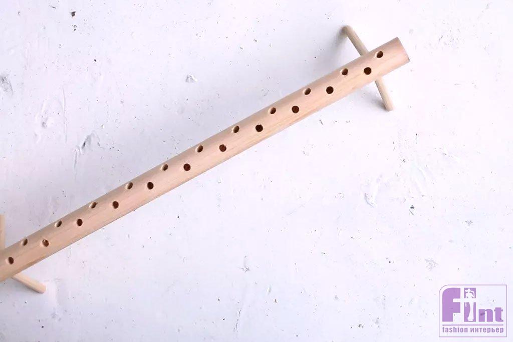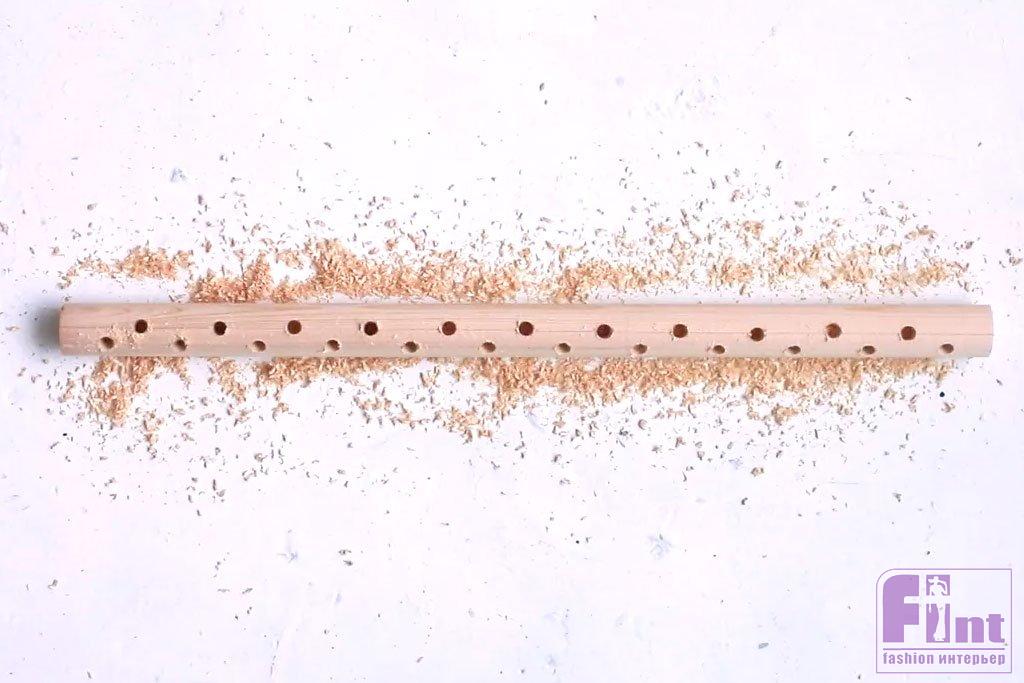 Приблизительно на уровне вторых отверстий с каждой стороны шканта проведите линию по его окружности. Поскольку диаметр нашего шканта равен 25 мм, длина окружности будет равна 78,5 мм. Найдите противоположную точку на шканте, отложив от точки между линиями расстояние по окружности равное половине длины окружности (39,3 мм). От этой точки отложите равные расстояния на линии окружности, примерно на расстояние в 13 мм. Это будет места крепления «ножек» подставки. Повторите разметку с обоих концов шканта и просверлите аналогичные отверстия такие же как вы сверлили сверху шканта, но используя более толстое сверло диаметром 10 мм.