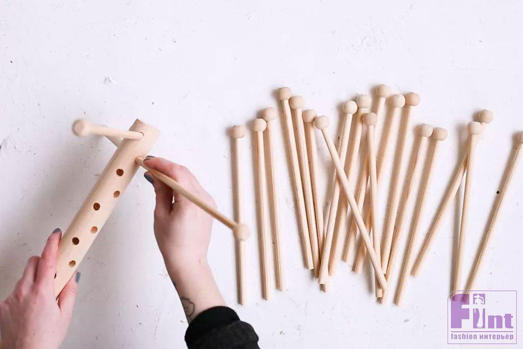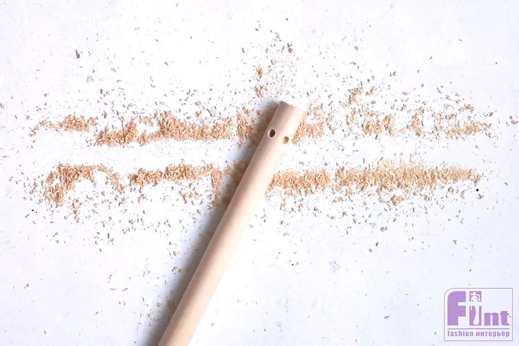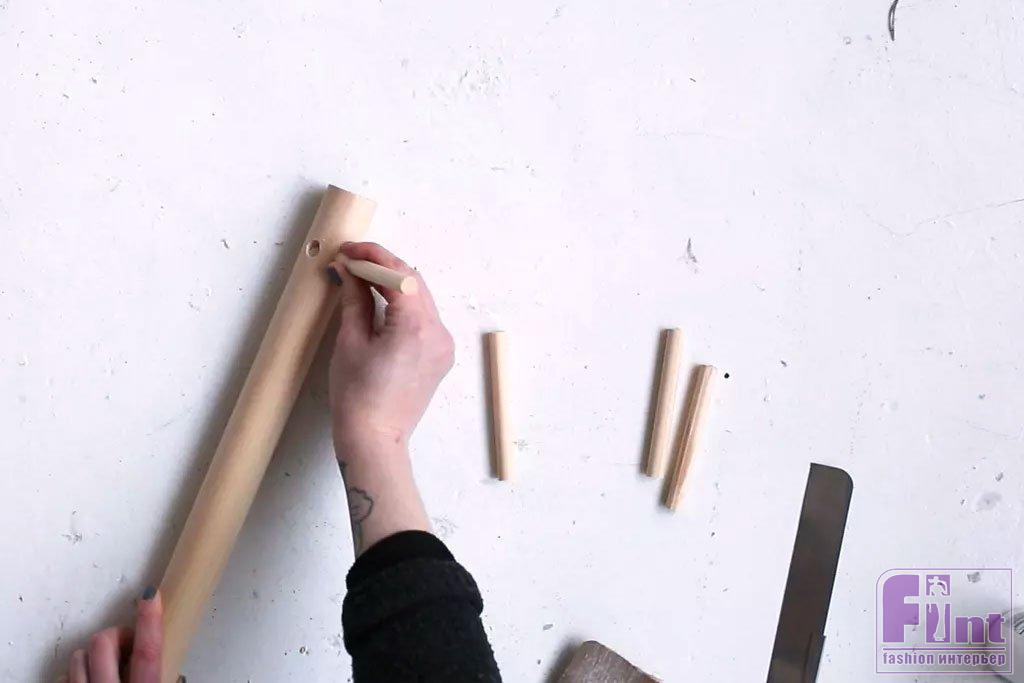 Отрежьте четыре куска шканта диаметром 10 мм длиной примерно 75 мм. Отшлифуйте концы наждачной бумагой и используйте немного клея для дерева, чтобы надёжно закрепить детали в каждом из четырёх отверстий в нижней части основы подставки.