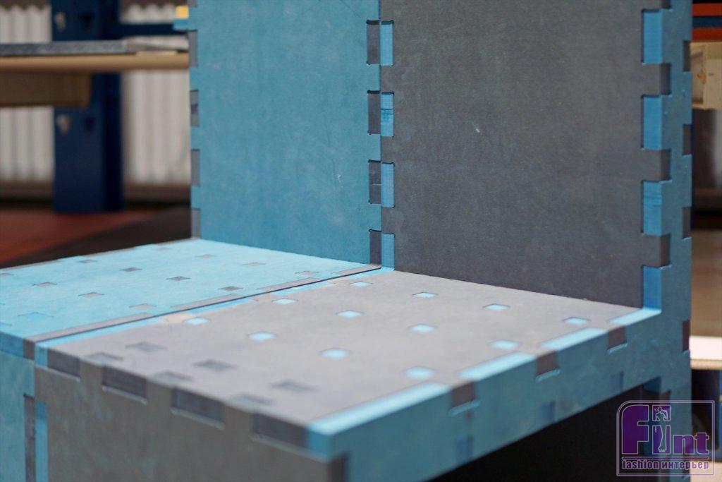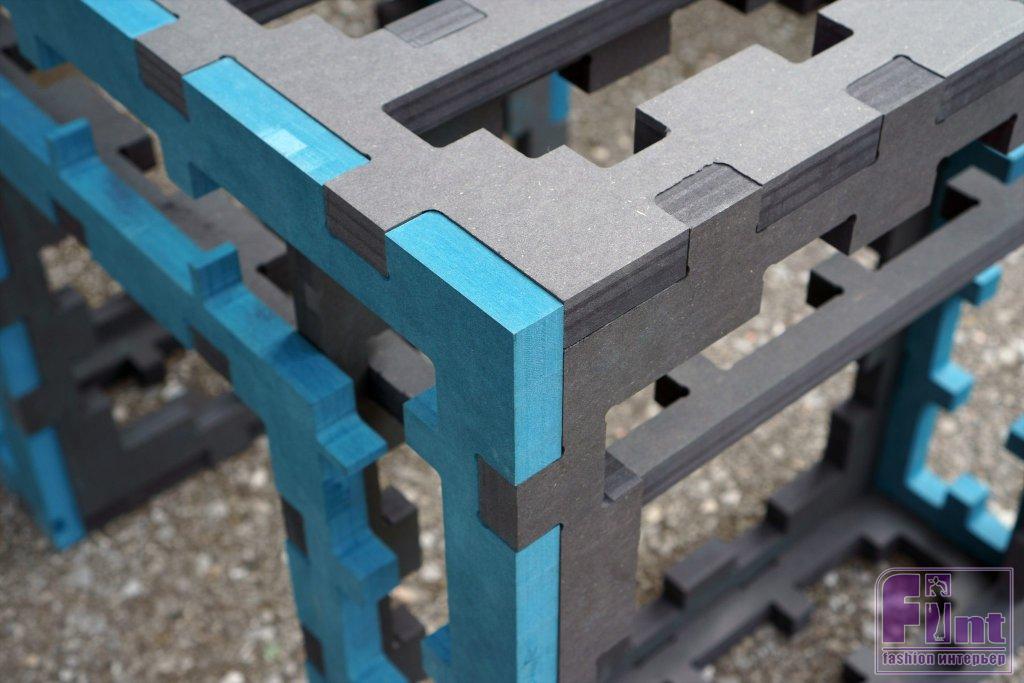 Концепт «TWINS-MDF» выполнен в очень приятной контрастной цветовой гамме. И «Рама» и «Каркас» изделия состоят из деталей тёмно-серого и серо-голубого цвета. Способ соединения деталей с квадратными вырезами по контурам, придаёт изделию дополнительную строгость и графичность, что свойственно многим изделиям японских дизайнеров и архитекторов.